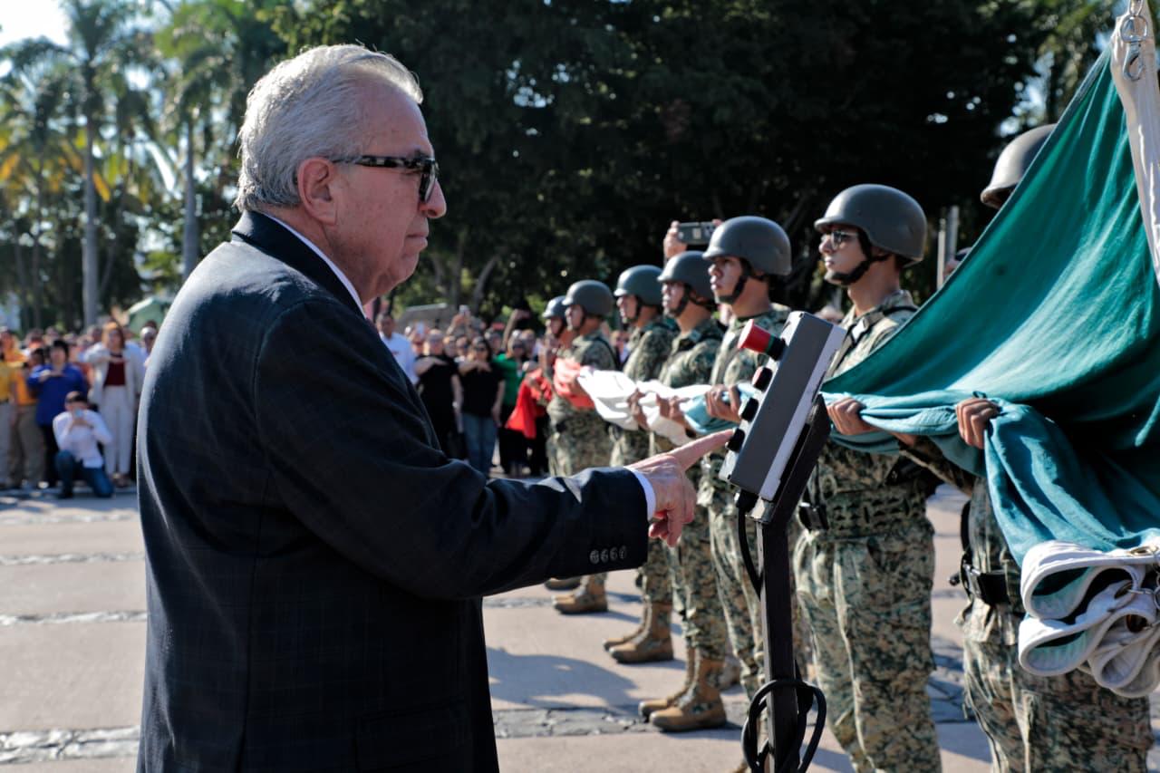 Culiacán, Sinaloa. – El gobernador Rubén Rocha Moya, acompañado de autoridades civiles y militares presidieron el acto conmemorativo al 142 aniversario del nacimiento del Gral. Ángel Flores y aniversario de los caídos en la lucha de la democracia de la plaza de las Tres Culturas, en Tlatelolco, con el izamiento de bandera a media hasta y honores de ordenanza en la plaza cívica de Palacio de Gobierno.