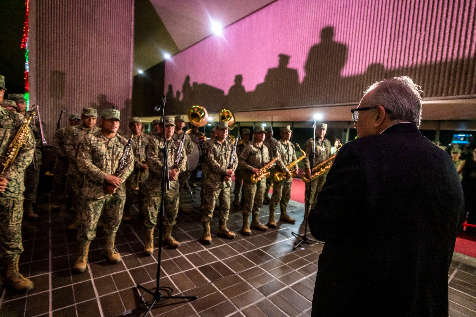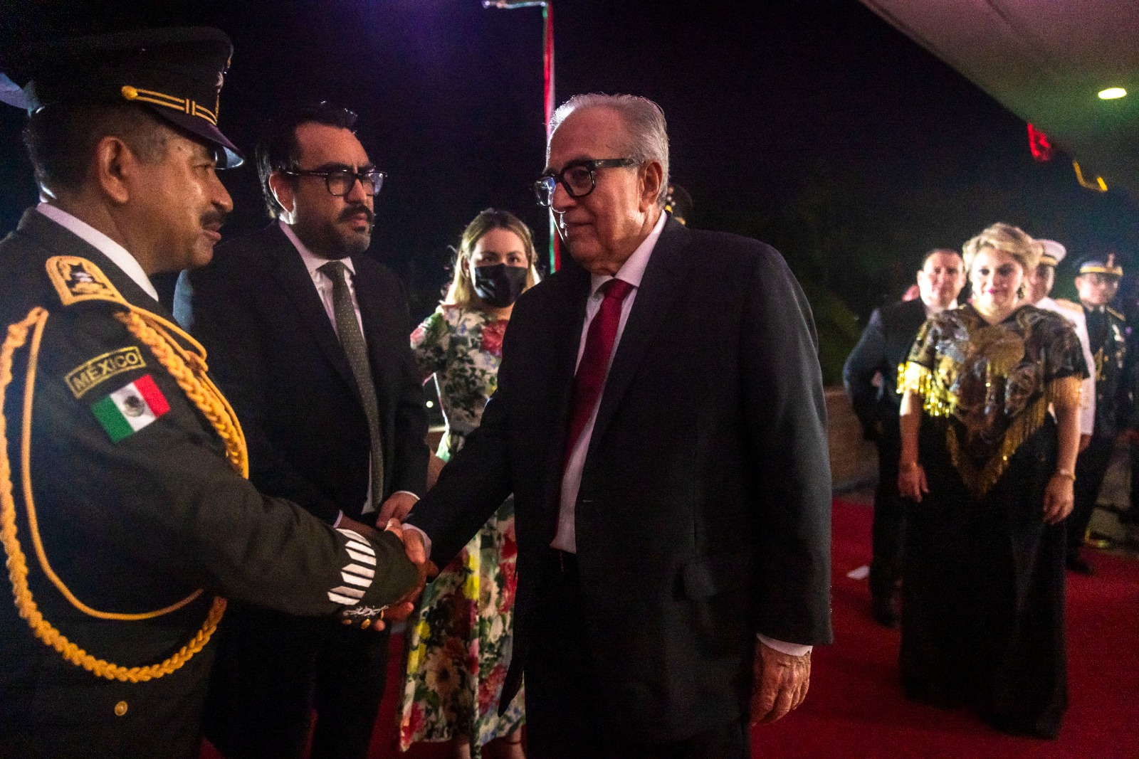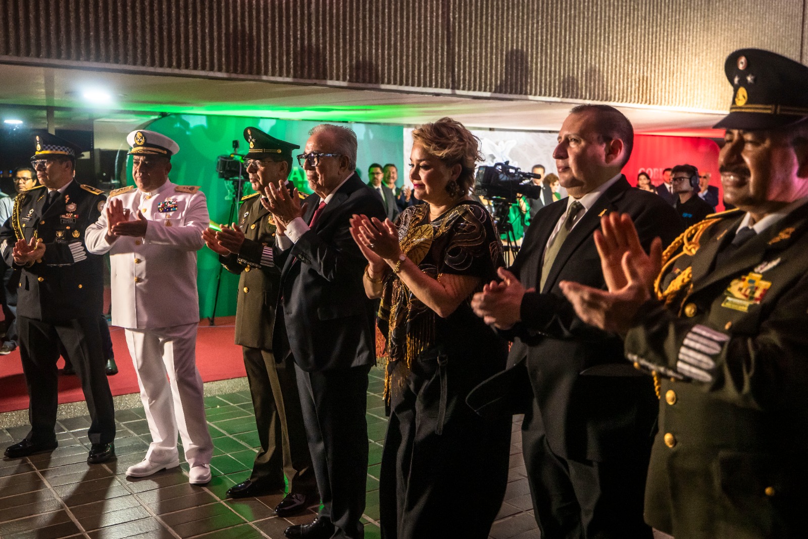 El gobernador Rocha estuvo acompañado en el balcón por su hija, la presidenta del Sistema DIF Sinaloa, Eneyda Rocha Ruiz; por la presidenta de la Mesa Directiva del Congreso del Estado, diputada Yeraldine Bonilla Valverde; por el presidente del Supremo Tribunal de Justicia, magistrado Jesús Iván Chávez Rangel; por el comandante de la Tercera Región Militar, general de División, Guillermo Briseño Lobera; por el comandante de la Novena Zona Militar, general de Brigada, Santos Gerardo Soto; y por el presidente municipal de Culiacán, Juan de Dios Gámez Mendívil.