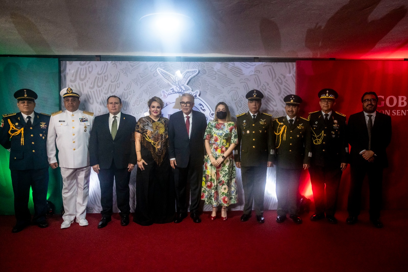 También por el comandante de la Cuarta Región Naval, vicealmirante José Daniel Reséndiz Sandoval; por el coordinador de la Guardia Nacional en Sinaloa, general Francisco Alvarado Terán; y por el comandante de la Base Aérea Militar Número 10, general de Grupo Piloto Aviador, Jesús Manuel Castro Castro, así como todos los integrantes de su gabinete.