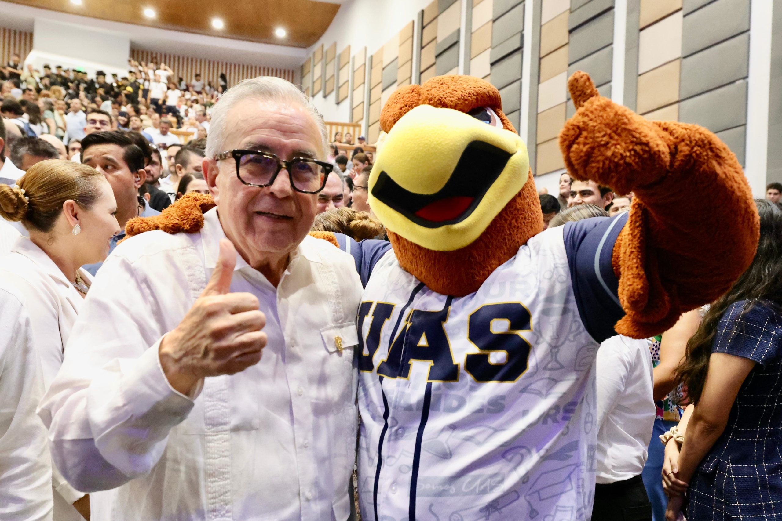 Por su parte, al darle la bienvenida a su alma máter, el rector Jesús Madueña Molina le agradeció al gobernador del estado el que les haga el honor a los universitarios de inaugurar el ciclo escolar 2025-2026 de esta máxima casa de estudios, la cual también recordó que fue dirigida por Rubén Rocha Moya.