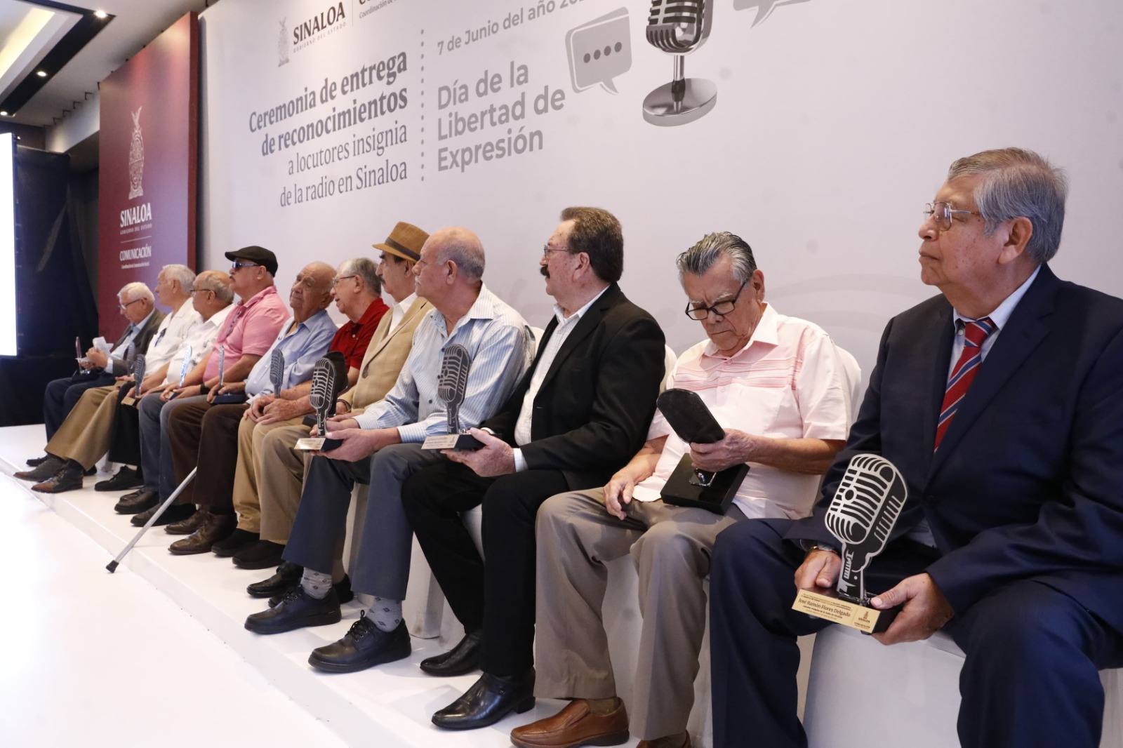Culiacán, Sinaloa. – En el marco de la conmemoración del Día de la Libertad de Expresión, el Gobierno del Estado de Sinaloa, a través de la Coordinación de Comunicación Social, encabezada por Adriana Ochoa del Toro y el Sindicato de Trabajadores de la Industria de la Radio y la Televisión delegaciones Culiacán, Mazatlán y Los Mochis, reconoció la destacada trayectoria de 12 locutores insignia del ayer, que forman parte de la historia periodística de Sinaloa.