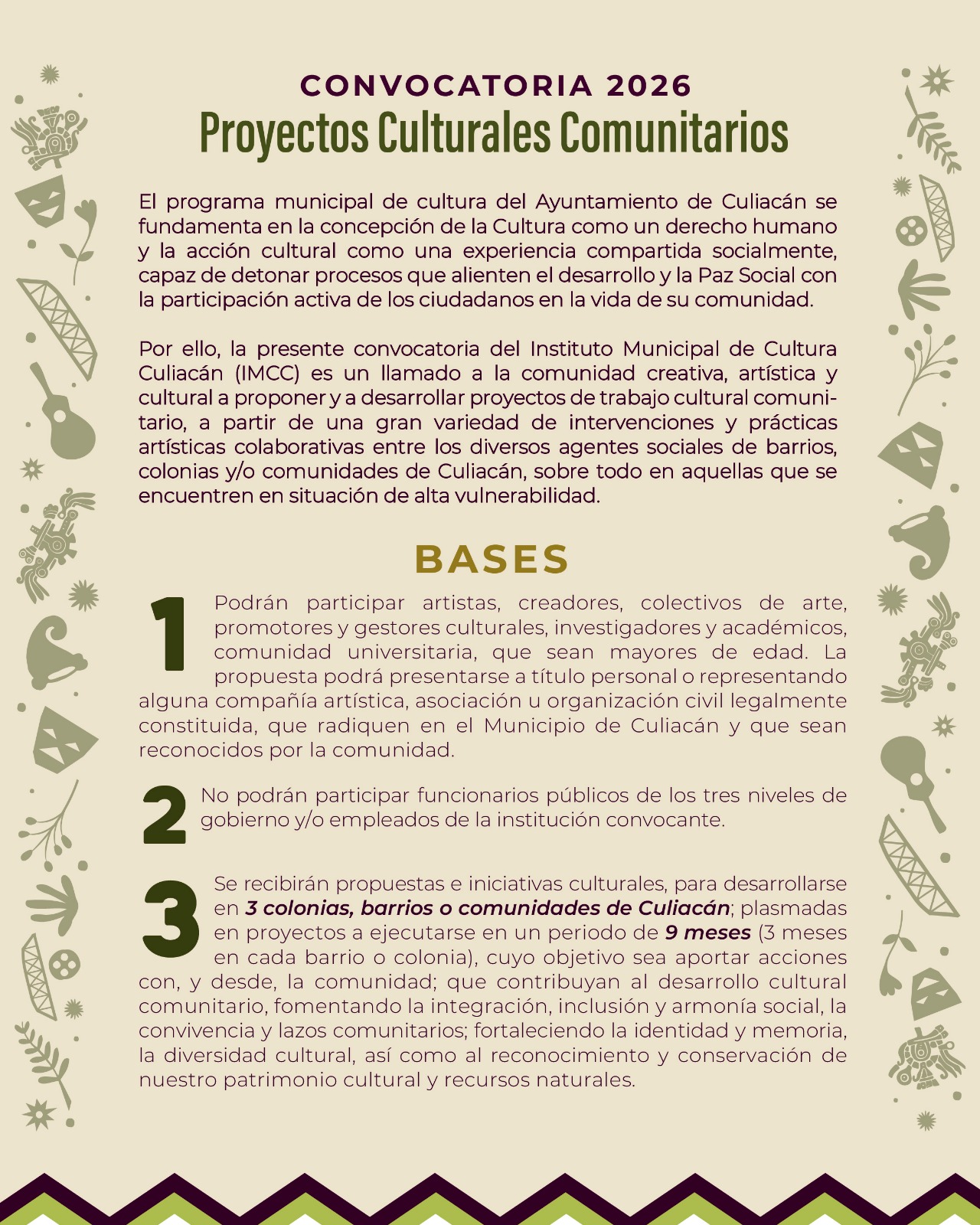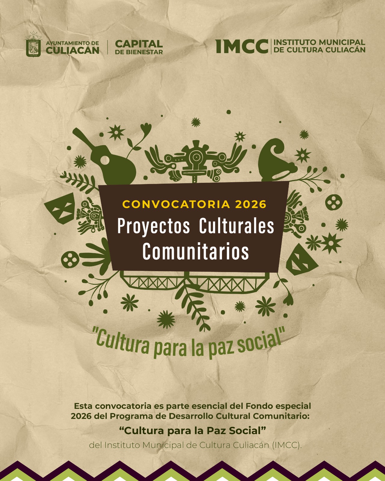 Culiacán, Sinaloa. – El Instituto Municipal de Cultura Culiacán (IMCC) invita a la comunidad creativa, artística y cultural a participar en la Convocatoria 2026 de Proyectos Culturales Comunitarios, orientada a impulsar acciones culturales que fortalezcan el desarrollo comunitario, la cohesión social y la Paz Social en el municipio.