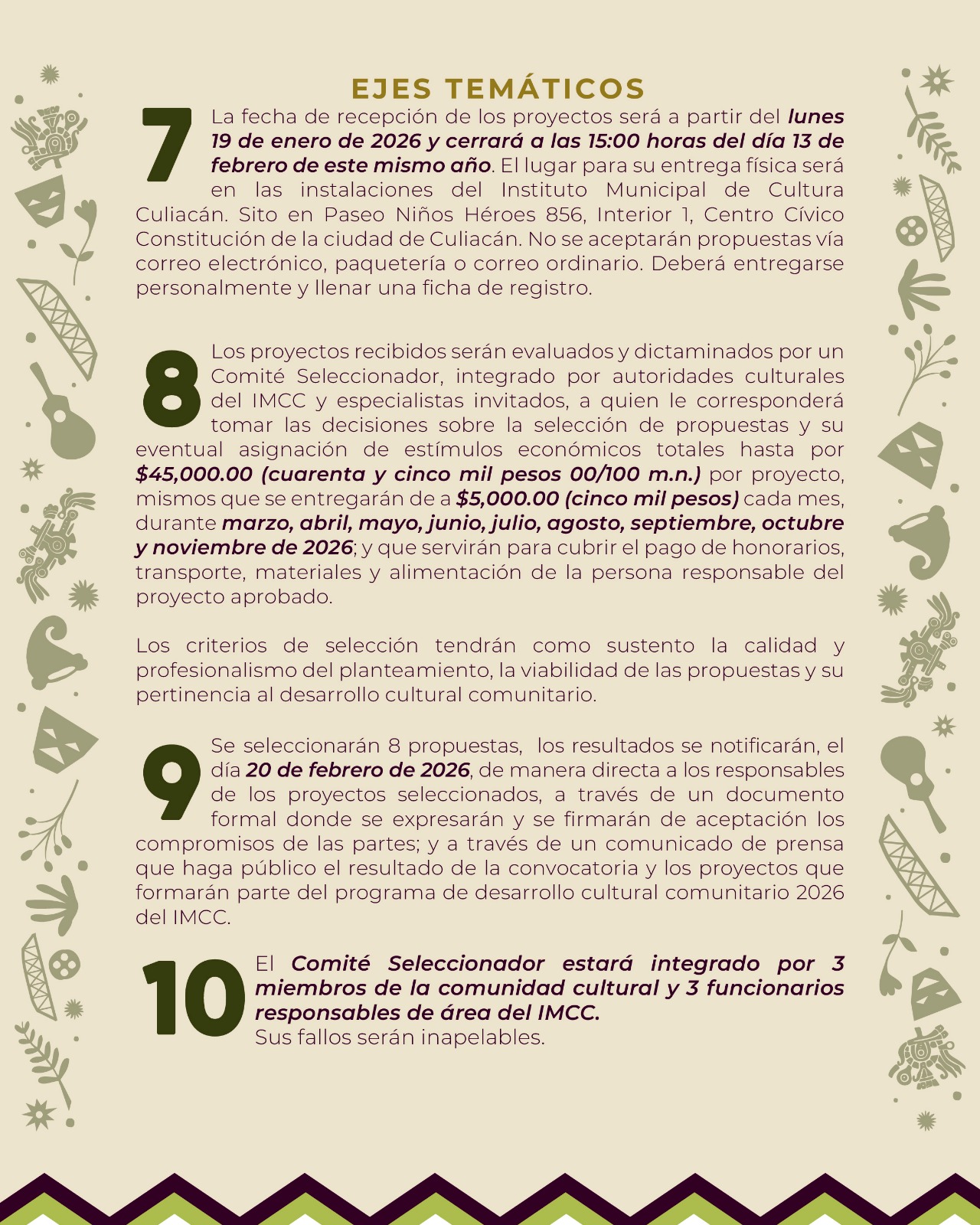 La recepción de proyectos inició este lunes 19 de enero y cierra el 13 de febrero de 2026 a las 15:00 horas, y deberá realizarse de manera presencial en las instalaciones del Instituto Municipal de Cultura Culiacán, ubicadas en Paseo Niños Héroes 856, Interior 1, Centro Cívico Constitución.