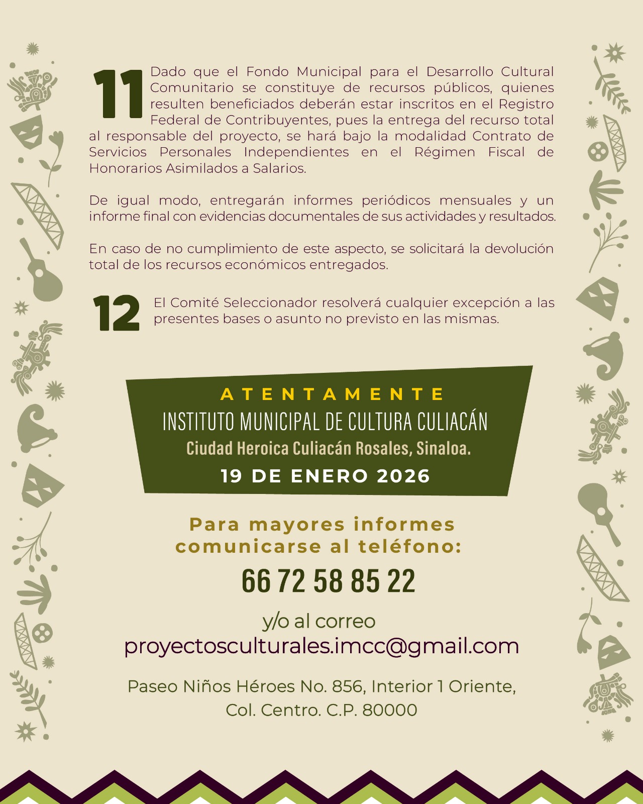 Para consultar las bases completas y recibir mayores informes, las personas interesadas pueden comunicarse al teléfono 667 258 85 22 o escribir al correo proyectosculturales.imcc@gmail.com