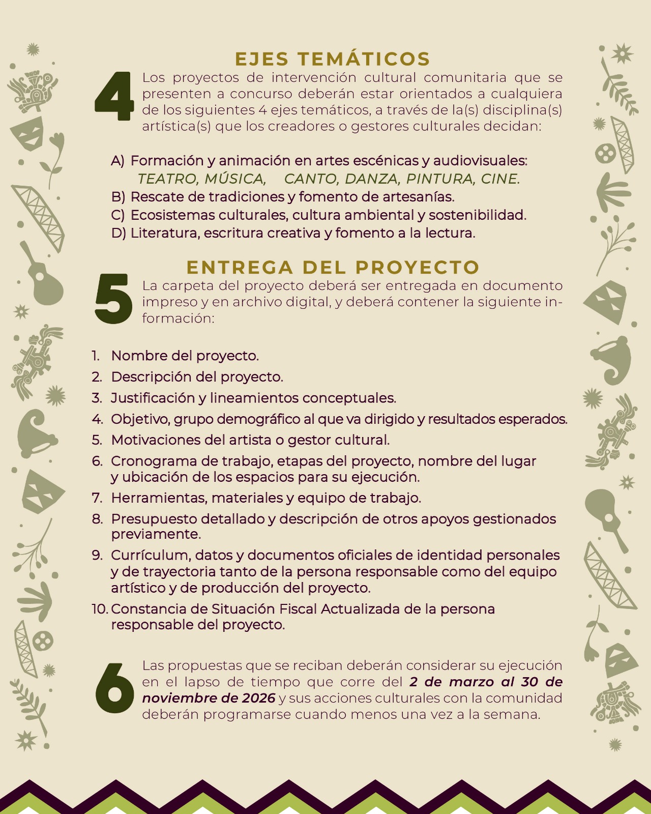 Se seleccionarán 8 proyectos, cada uno con un apoyo económico total de 45 mil pesos, destinados a su ejecución durante un periodo de nueve meses, de marzo a noviembre de 2026. Las propuestas deberán alinearse a alguno de los ejes temáticos: formación y animación artística, rescate de tradiciones y artesanías, cultura ambiental y sostenibilidad, o literatura y fomento a la lectura.