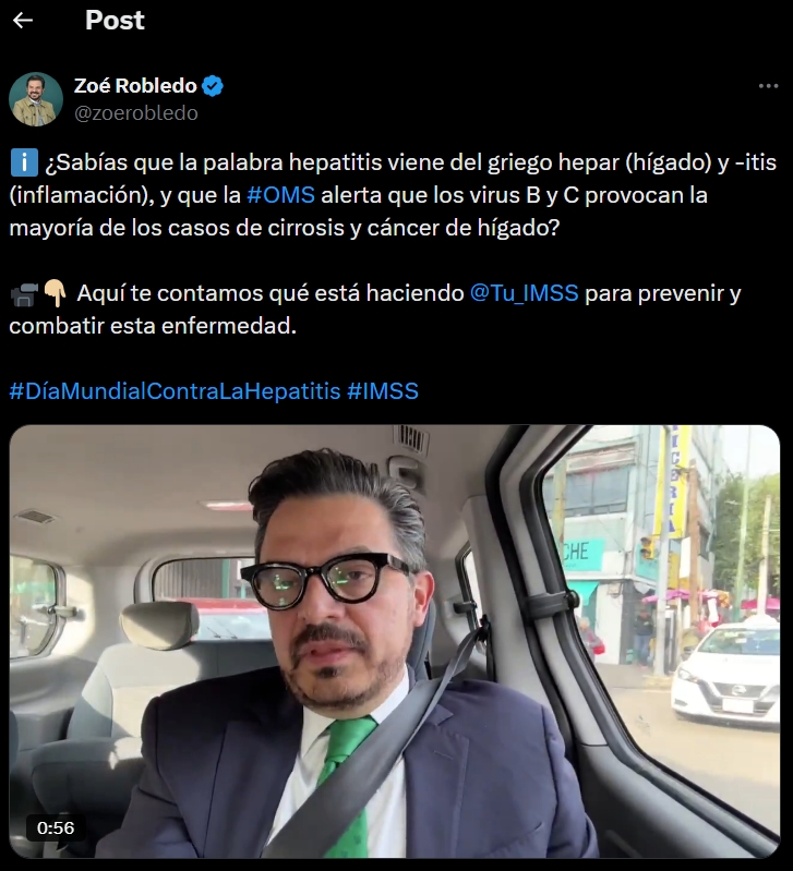 Ciudad de México. – En el marco del Día Mundial contra la Hepatitis, el director general del Instituto Mexicano del Seguro Social (IMSS), Zoé Robledo, reiteró el compromiso institucional con la prevención, detección y tratamiento oportuno de los distintos tipos de hepatitis.