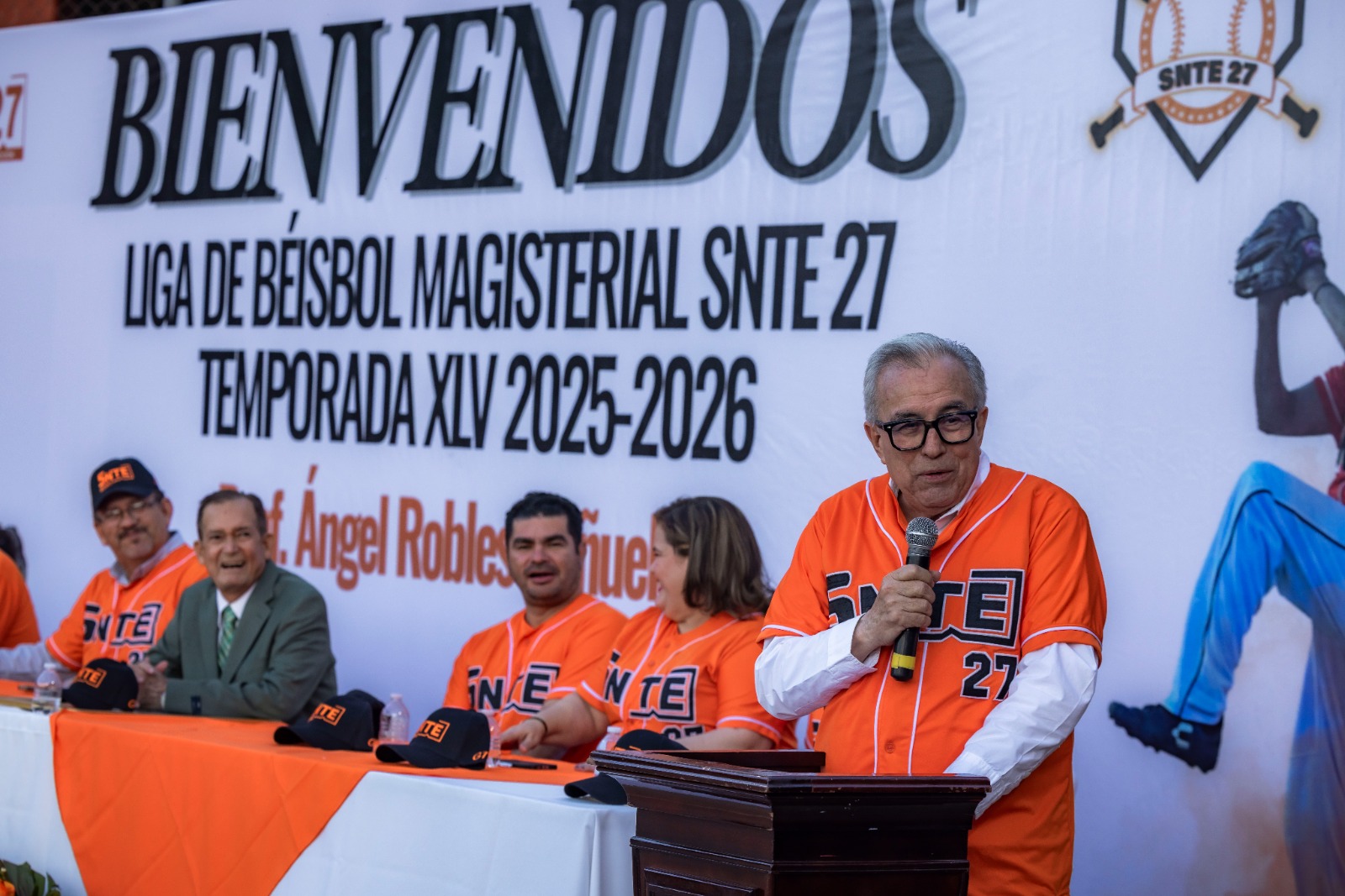 El evento contó con la presencia de Rodolfo Valenzuela, presidente de la Mesa Directiva del Congreso; Yeraldine Bonilla, secretaria General de Gobierno; Joaquín Landeros, secretario de Administración y Finanzas; Raúl Montero Zamudio, secretario de Obras Públicas; Juan de Dios Gámez, alcalde municipal; Karina Martínez Montaño, diputada federal; Cristian Álvarez Moreno, presidente de la Liga de Béisbol del SNTE 27; el homenajeado Ángel Robles Bañuelos, así como, autoridades educativas, directores de instituciones participantes y familias en general.