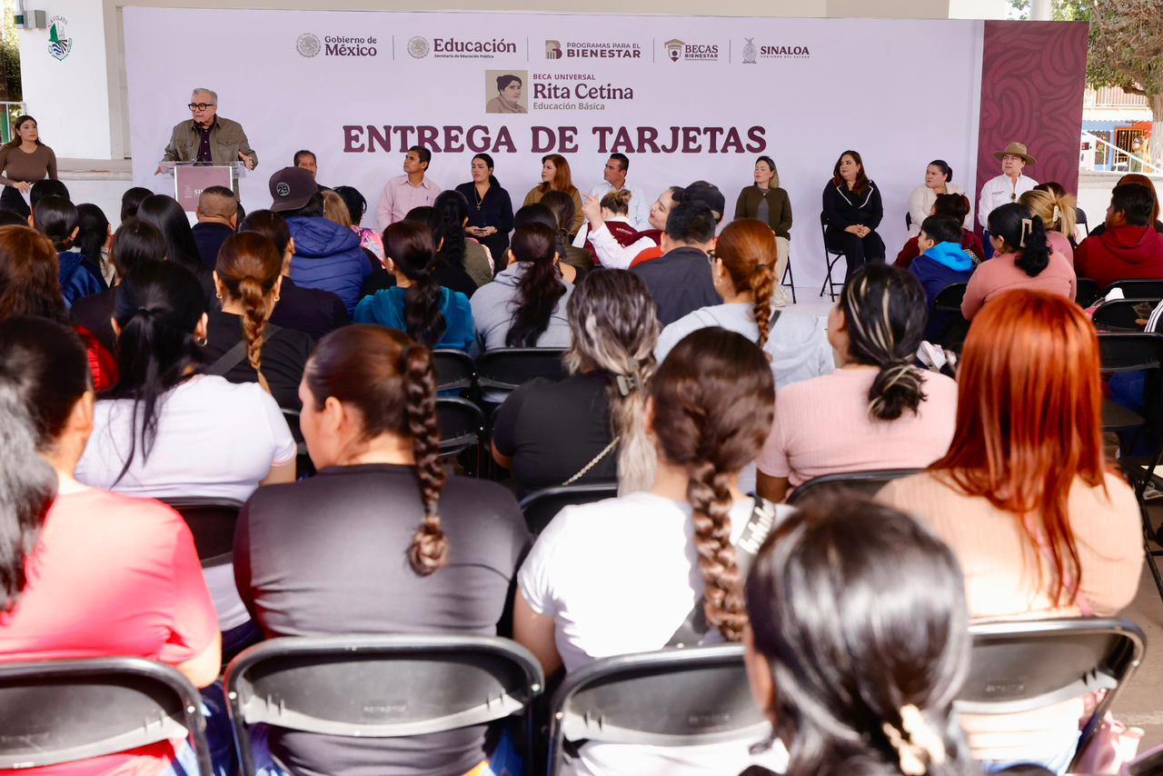 Villa Ángel Flores, Navolato, Sinaloa. – El gobernador Rubén Rocha Moya inició este miércoles con la entrega de las tarjetas del Bienestar correspondientes a la Beca Rita Cetina Gutiérrez, para 222 alumnas y alumnos del nivel de secundaria de cuatro escuelas de Navolato, que forman parte de un total de 28 mil estudiantes de nuevo ingreso que gozarán de este beneficio, de un universo de 137 mil estudiantes de secundaria en todo Sinaloa.