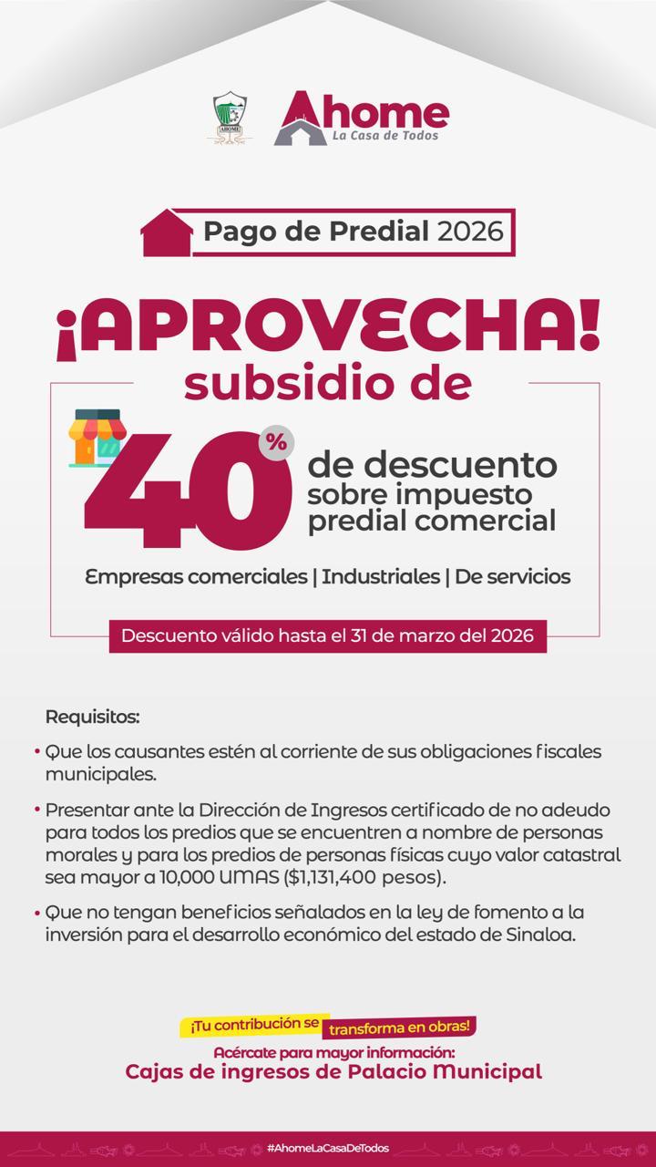 Los Mochis, Ahome, Sinaloa.- Luego de que el Cabildo aprobó programa de descuentos en impuesto predial de hasta un 40% al sector industrial, comercial y de servicios, la Tesorería Municipal anuncia que dicho beneficio está abierto a partir de esta fecha en cajas, en línea, en bancos y demás alternativas de pago, hasta el 31 de marzo, por lo que invita a este importante sector de contribuyentes a aprovecharlo.