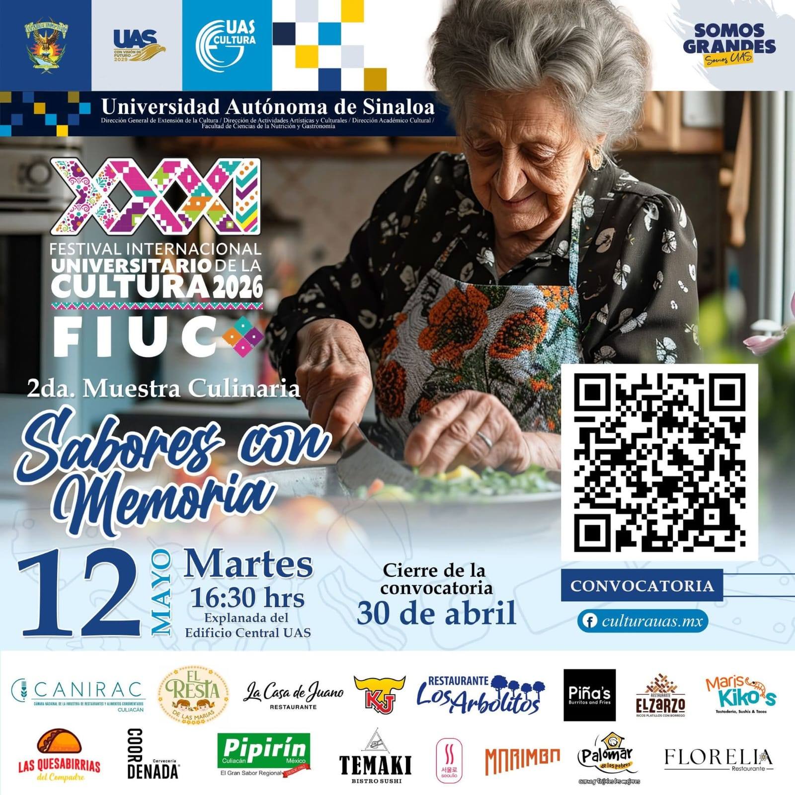 Las personas interesadas tienen hasta el 30 de abril para realizar su registro. Para consultar las bases e inscribirse, pueden escanear el código QR de la convocatoria disponible en la página de Cultura UAS, o bien, ingresar directamente al sitio web: https://sites.google.com/uas.edu.mx/saboresconmemoria/inicio.