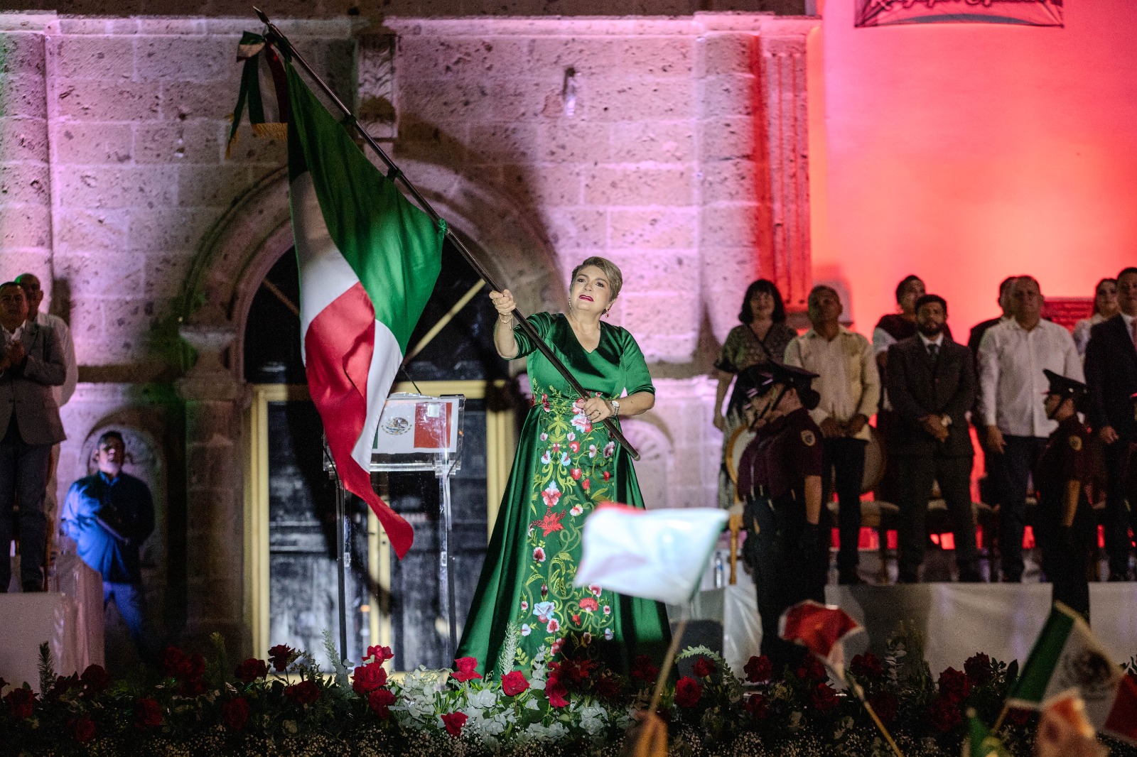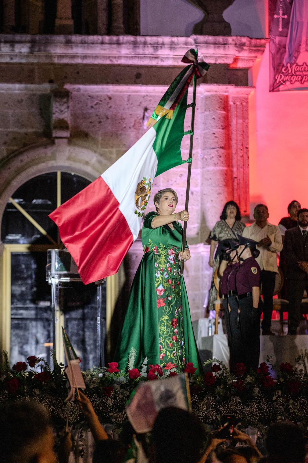 La presidenta municipal recibió la Bandera Nacional por parte de la Escolta y Banda de Guerra del CETIS 108 y con voz fuerte dijo la tradicional arenga: