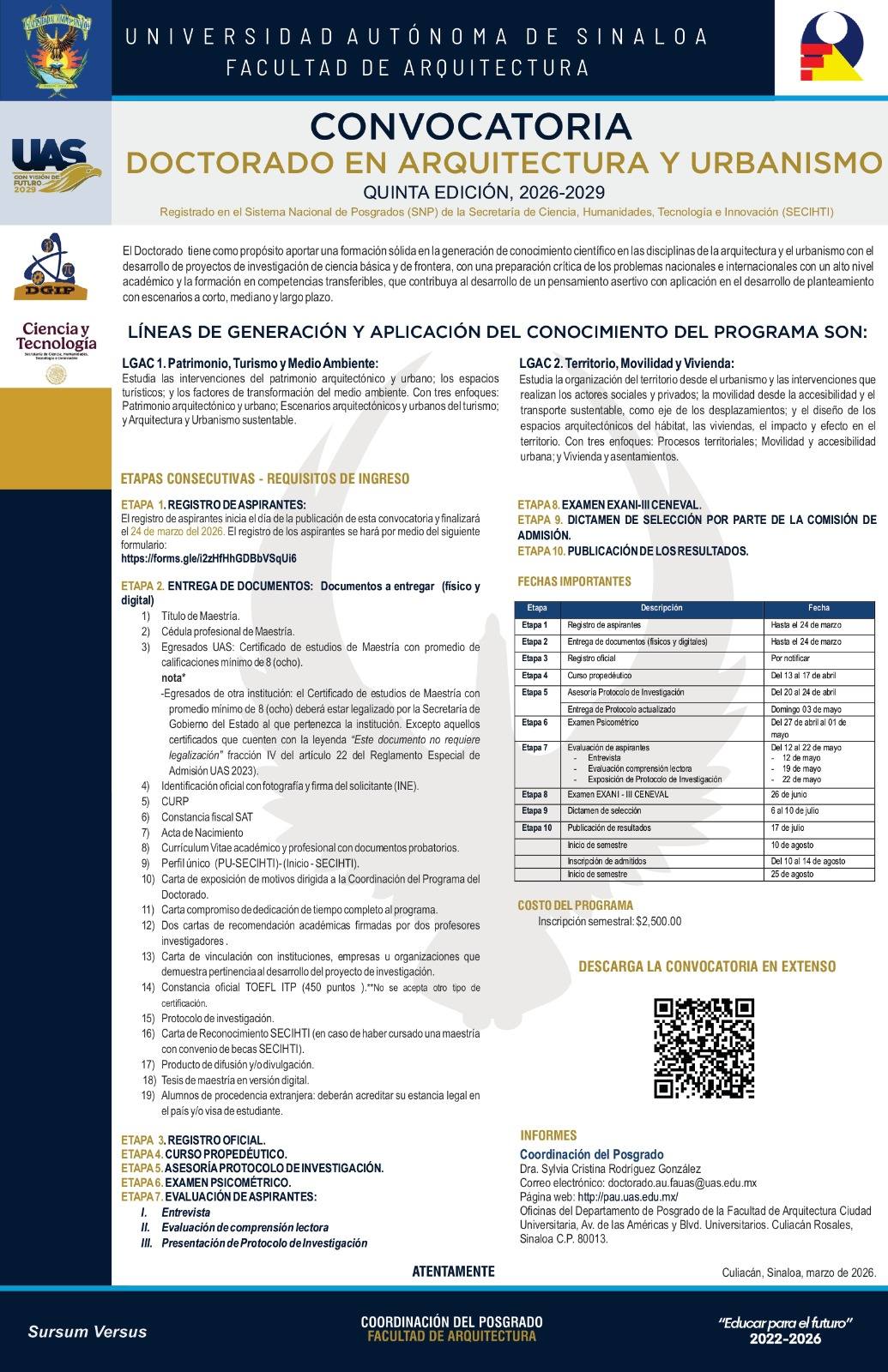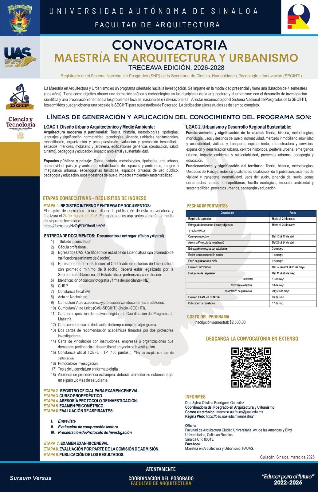 El Posgrado de la Facultad de Arquitectura (FAUAS) de la Universidad Autónoma de Sinaloa (UAS) abrió la convocatoria para la decimotercera edición de la Maestría y la quinta edición del Doctorado en Arquitectura y Urbanismo. Ambos programas están reconocidos ante el Sistema Nacional de Posgrados de la Secretaría de Ciencia, Humanidades, Tecnología e Innovación (SECIHTI).
