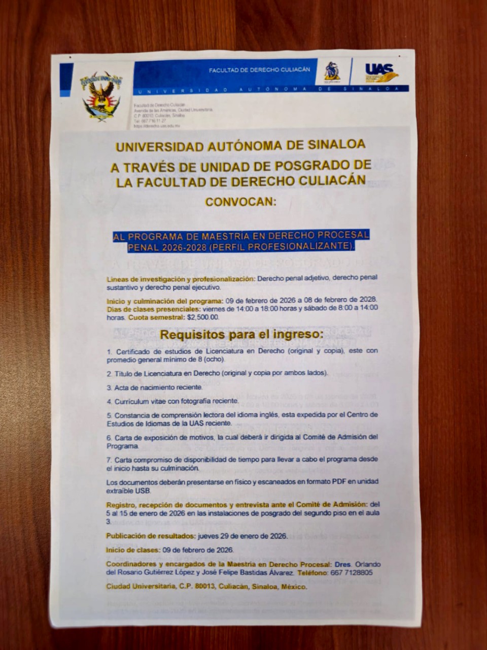 De igual manera, informó que la publicación de resultados será el 29 de enero de 2026; agregó que la cuota semestral es de 2 mil 500 pesos, e invitó a los interesados a acercarse a la Unidad de Posgrado de la Facultad de Derecho Culiacán para recibir más información.