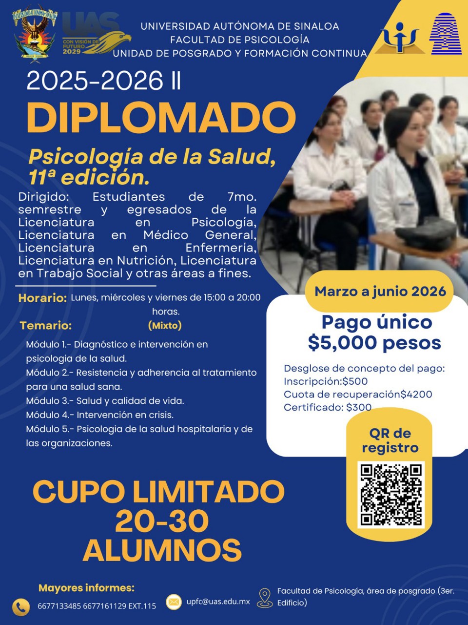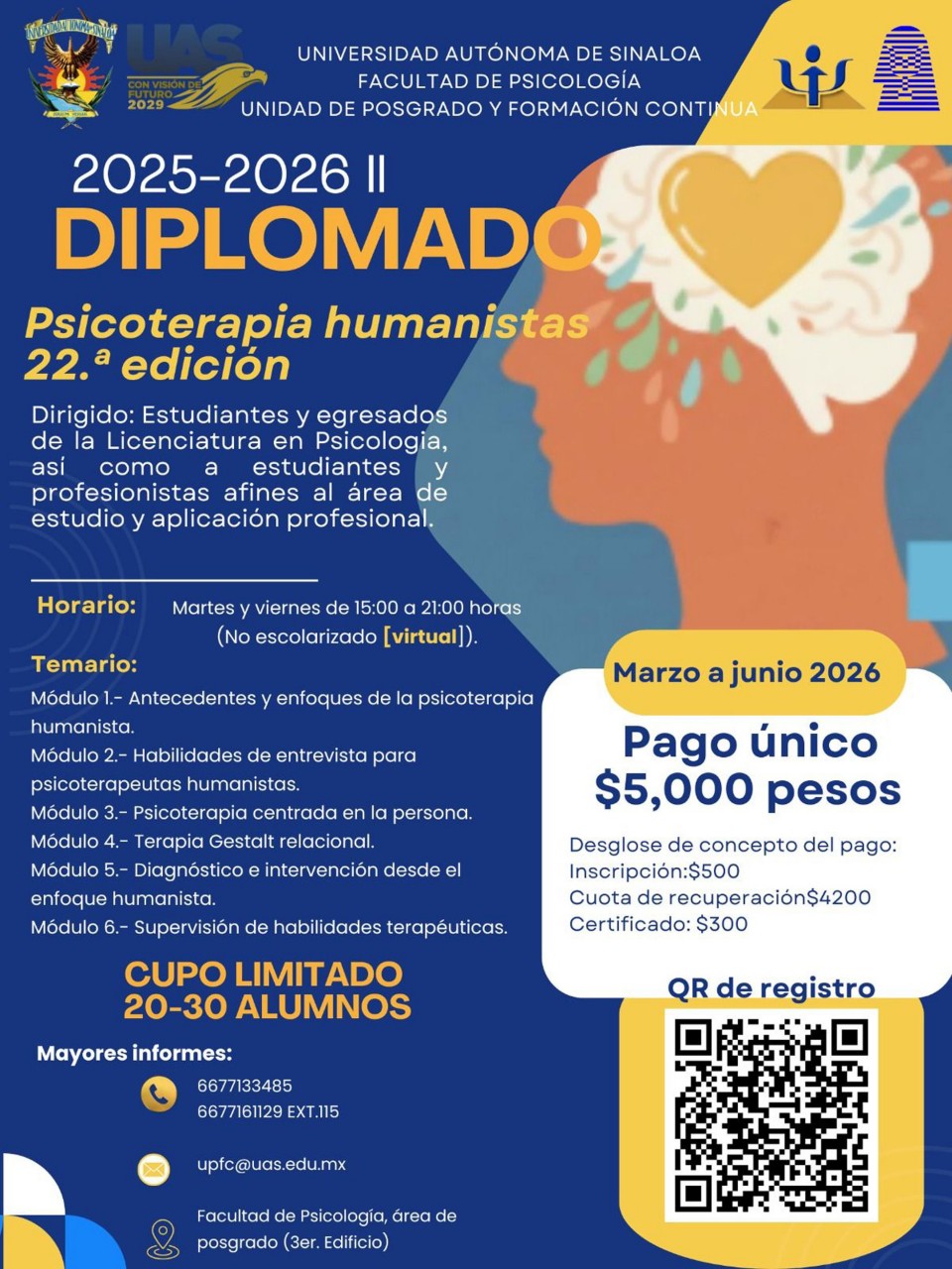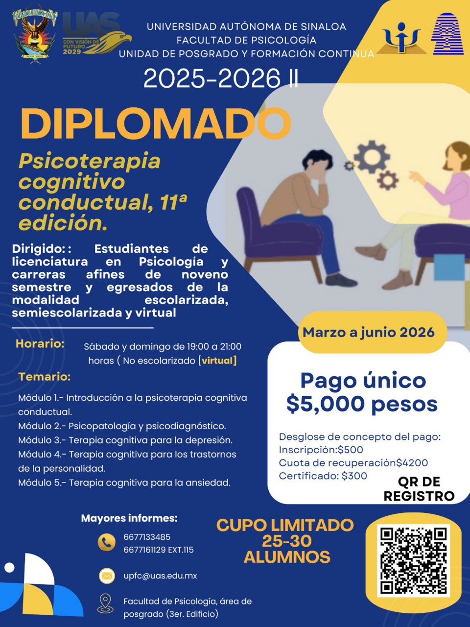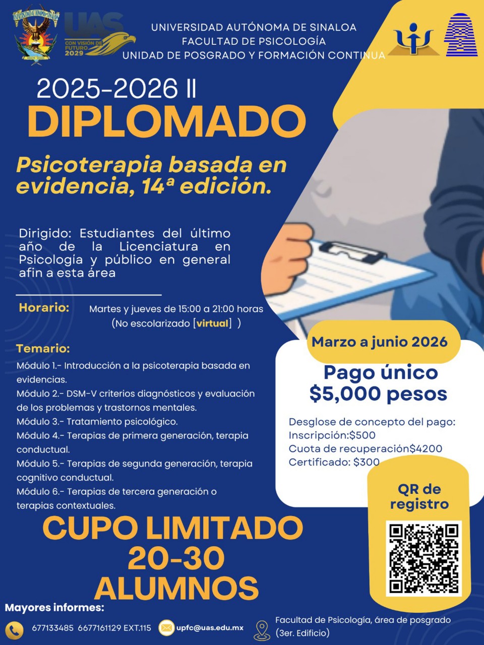 La Facultad de Psicología de la Universidad Autónoma de Sinaloa (UAS) convoca a estudiantes y egresados de Psicología, así como a profesionales de ciencias afines, a inscribirse en su oferta de diplomados en modalidad virtual para el periodo marzo-junio 2026. Estos programas están diseñados para responder a las nuevas demandas de salud mental y actualización profesional.