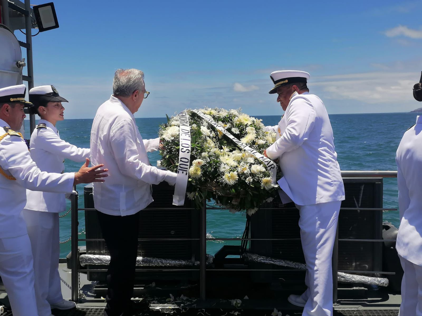 Como parte del acto ceremonial, el Gobernador Rocha, acompañado de las autoridades de la Cuarta Región Naval, realizaron un recorrido en la embarcación “Isla Maria Madre”, en aguas de altamar, desde donde arrojaron una ofrenda floral, en honor a los marinos caídos en cumplimiento de su deber.