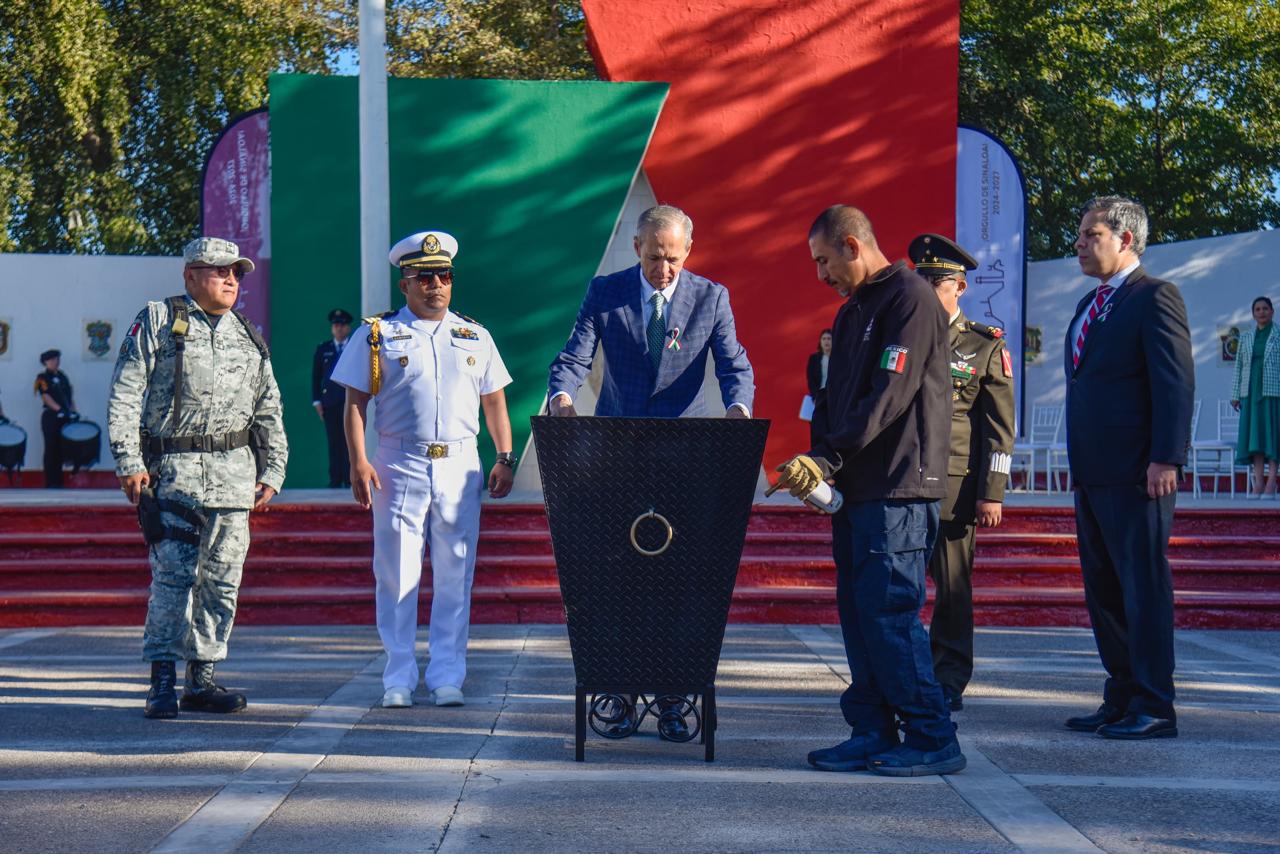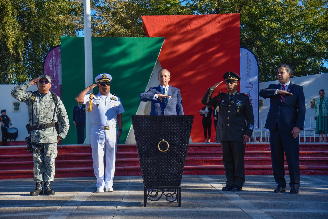 La emotiva ceremonia en el Monumento a La Bandera, estuvo encabezada por el Alcalde Gerardo Octavio Vargas Landeros, quien se encargó de abanderar a nuevas Escoltas e incinerar los lienzos que ya cumplieron con su vida útil.