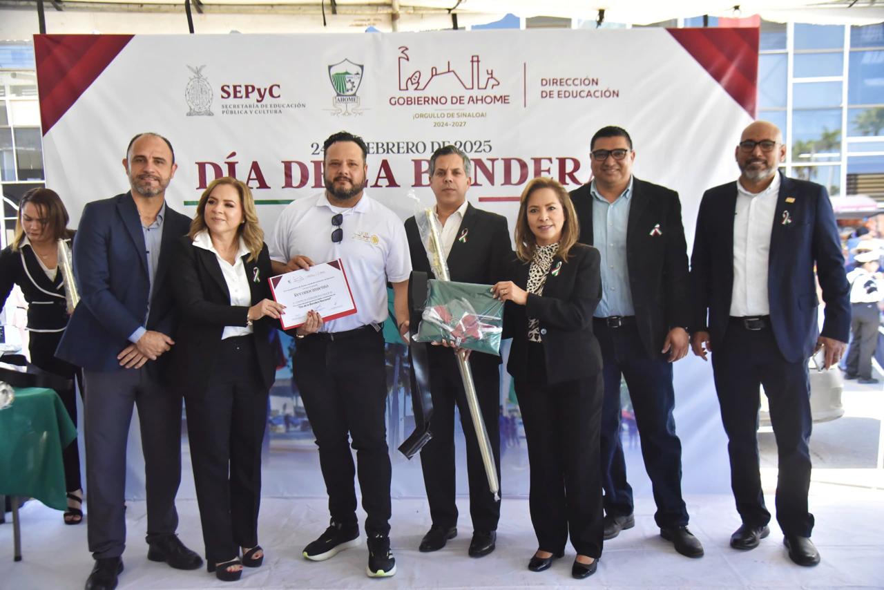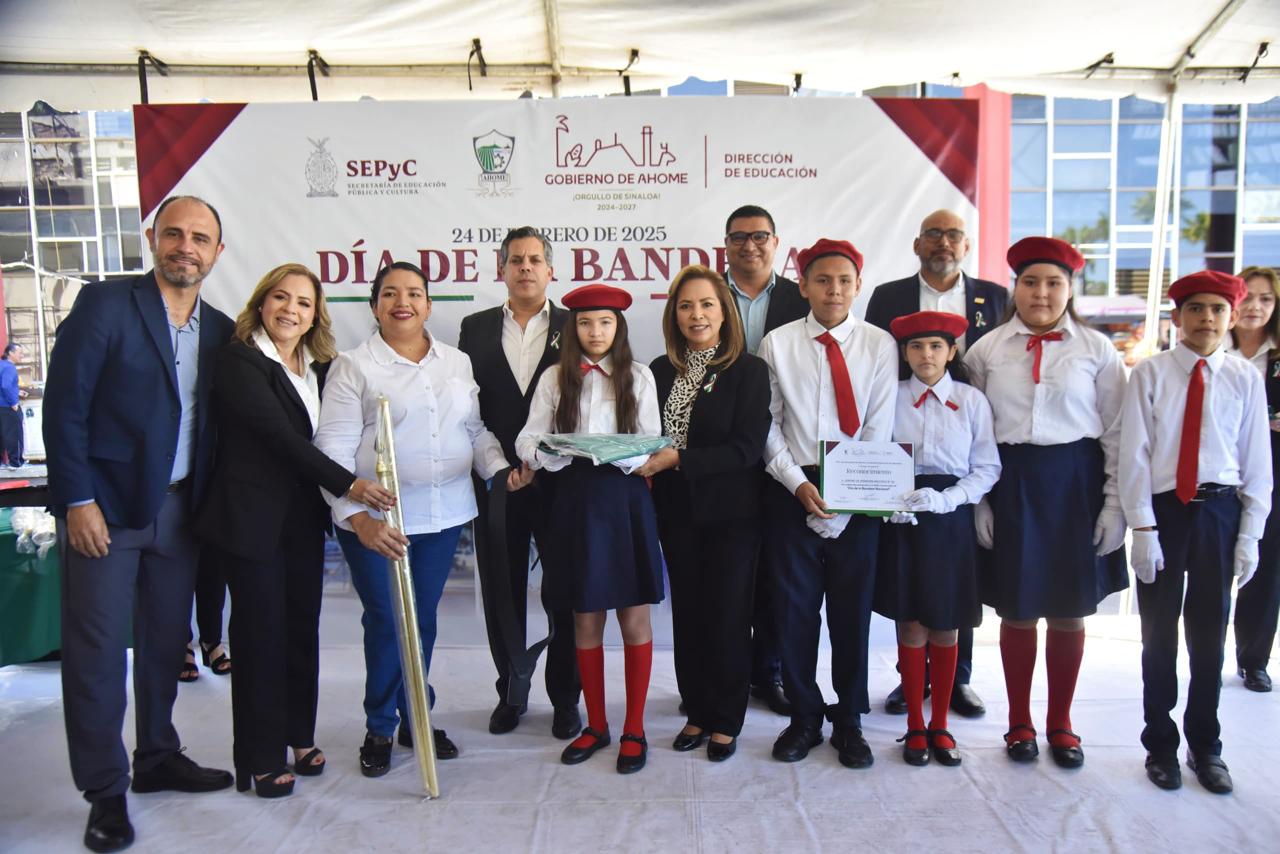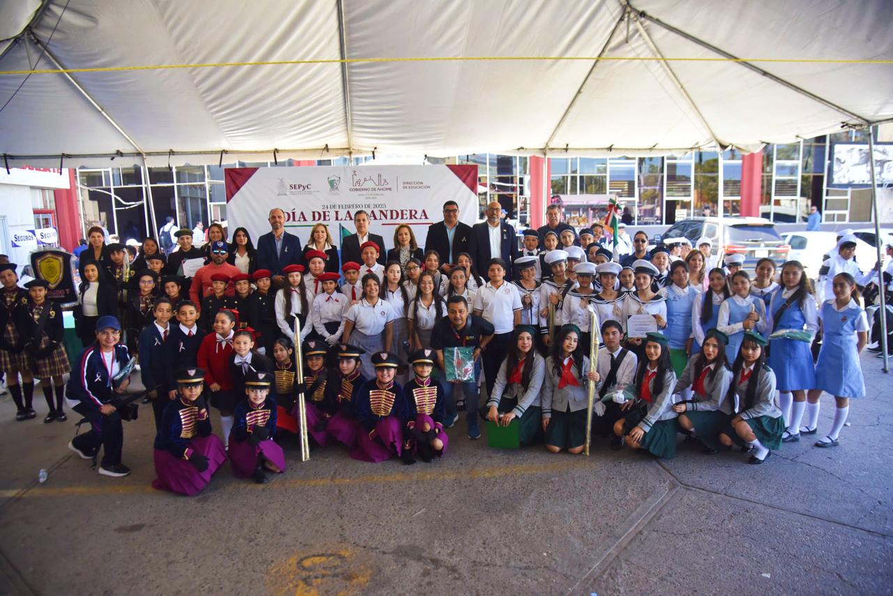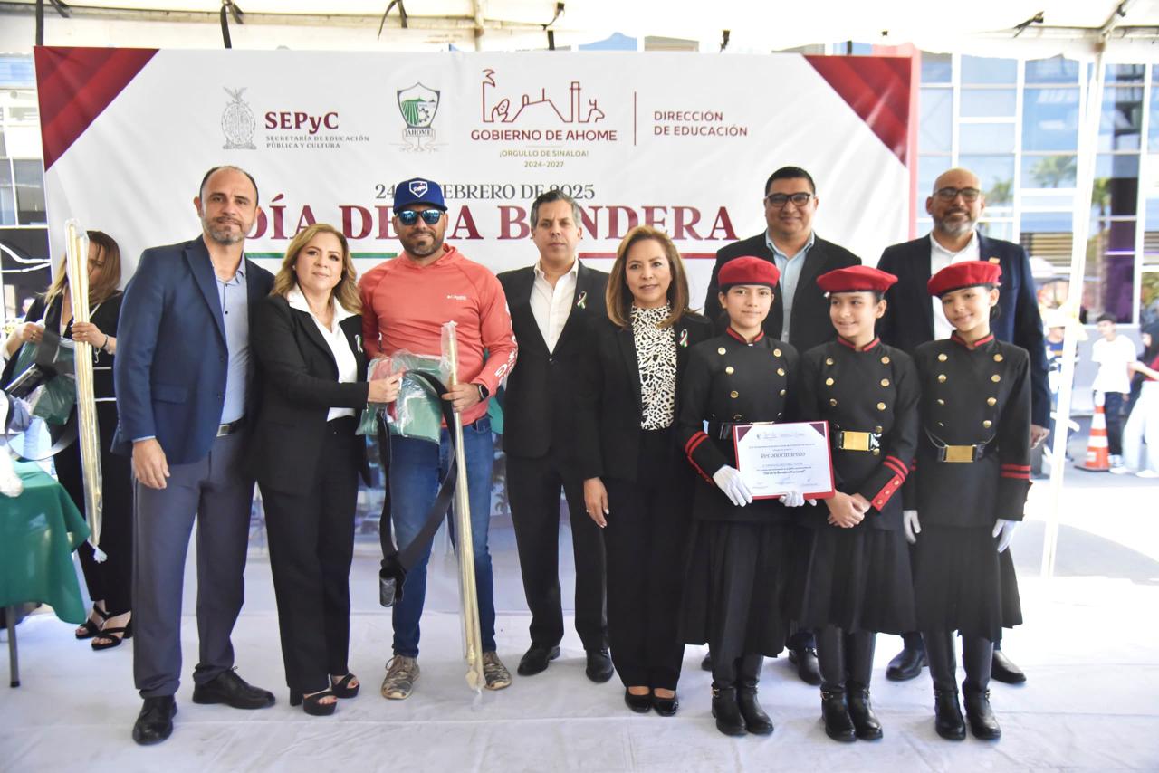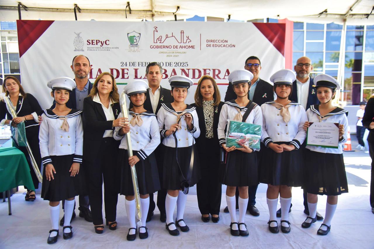 Las escoltas que recibieron nuevo Lábaro son las primarias Emiliano Zapata y Jacinto López Moreno; los jardines de niños Gabriela Mistral y María Concepción Millán Nieblas, y la secundaria general No. 3 Manuel Romero Camacho.