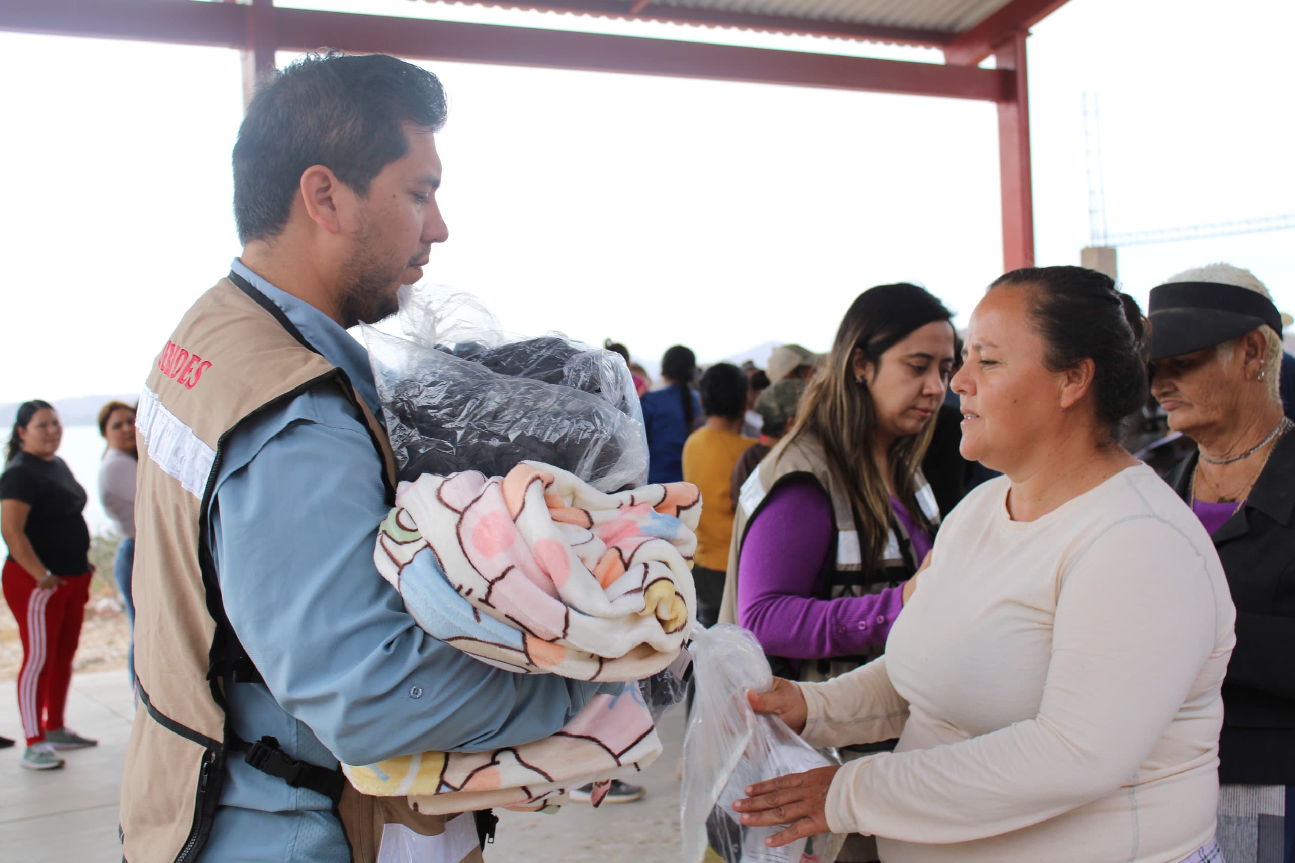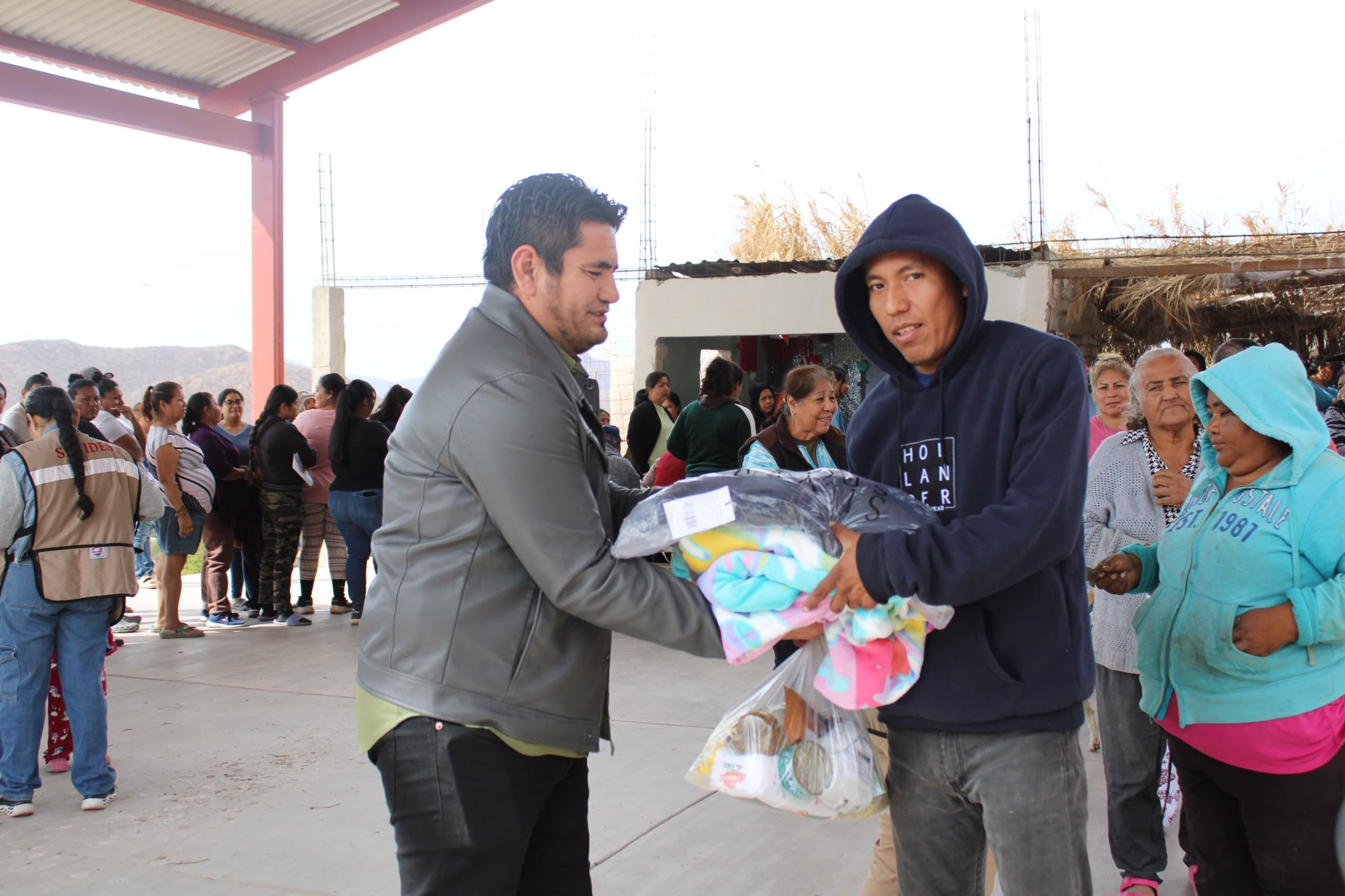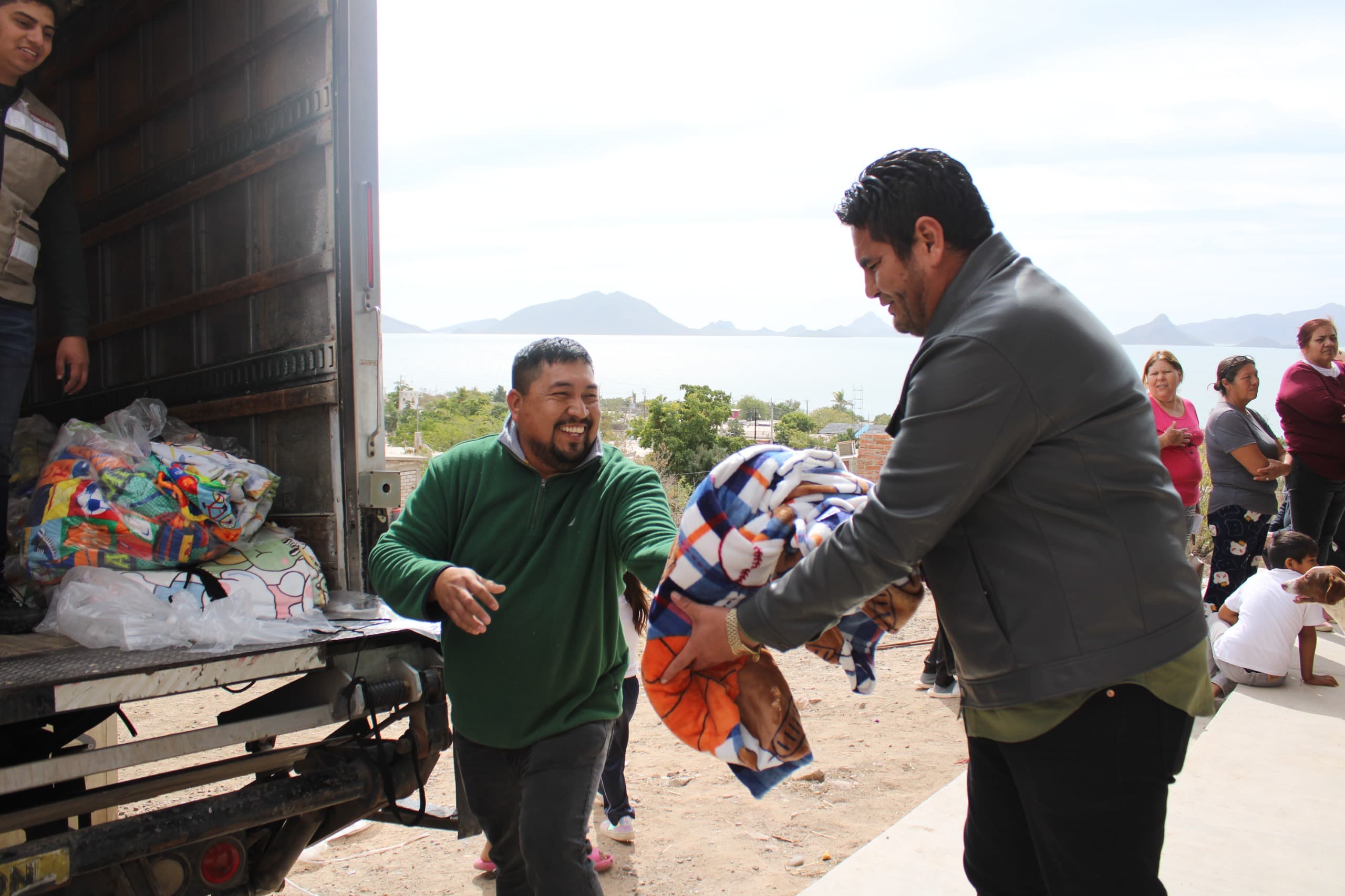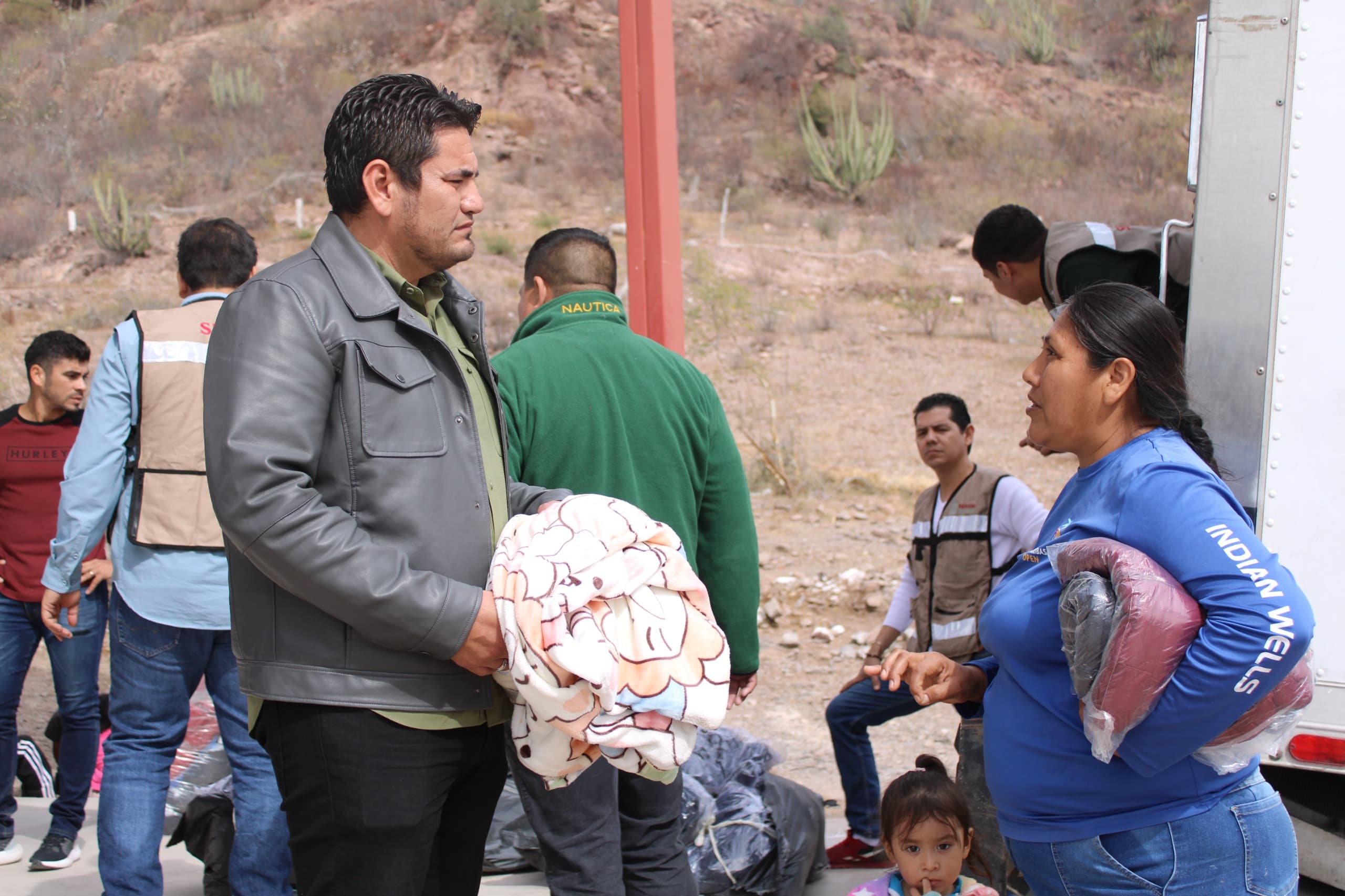 Juan José Ríos, Sinaloa. – El Secretario del H. Ayuntamiento Alfredo Magallanes y el director de Participación Ciudadana Rosario de los Santos estuvieron en representación de la alcaldesa Evangelina Llanes Carreón con el fin de recibir y compartir los apoyos de cobijas, alimentos indispensables y chamarras abrigadoras por parte de SEBIDES estatal.