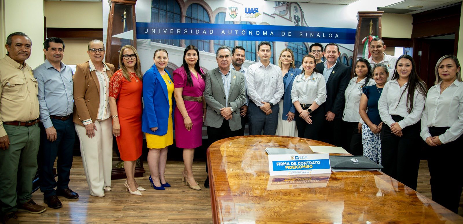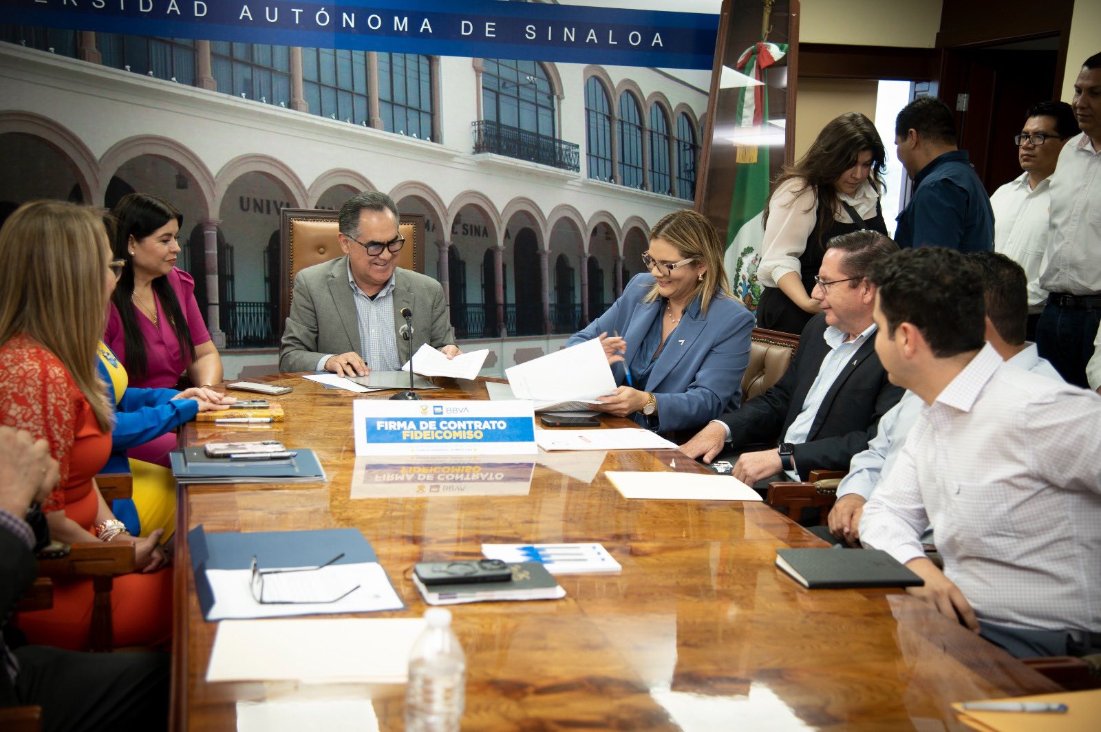 Por parte de la Universidad, firmó el documento el rector, doctor Jesús Madueña Molina; por parte del banco, la delegada fiduciaria de BBVA, la maestra Laizmy Zuhei Sandoval Vega.