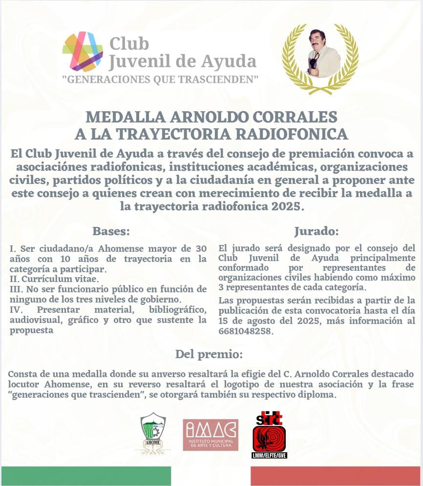 Los Mochis, Sinaloa. – Representantes del Club Juvenil de Ayuda, Sindicato de Trabajadores de la Industria de la Radio, Televisión y Telecomunicaciones y del Instituto Municipal de Arte y Cultura de Ahome lanzaron la convocatoria para la entrega de la Medalla Arnoldo Corrales.