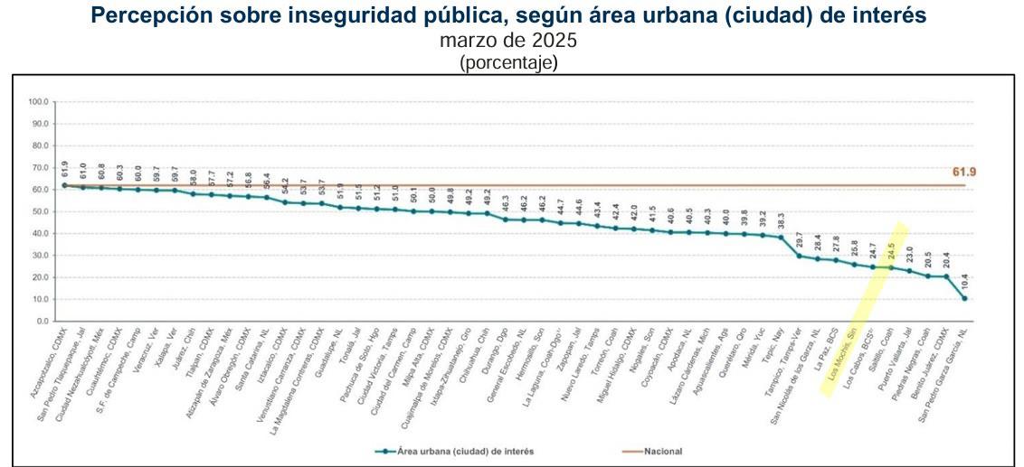 Ciudad de México. – La ciudad de Los Mochis vuelve a figurar entre las diez ciudades del país con menor percepción de inseguridad, de acuerdo con la Encuesta Nacional de Seguridad Pública Urbana (ENSU), correspondiente al primer trimestre de 2025, elaborada por el Instituto Nacional de Estadística y Geografía (INEGI).