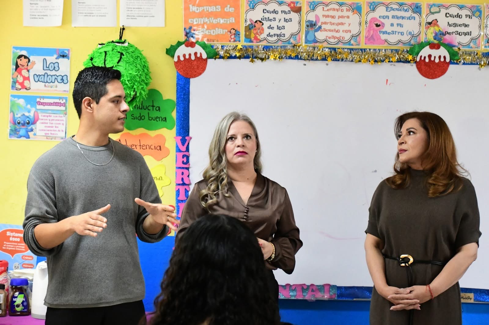 La Secretaria de Educación Pública y Cultura, Gloria Himelda Félix Niebla, acompañada por la Subdirectora de Primarias Federalizadas, Profa. María Engracia Uzeta Figueroa, y el Jefe del Departamento de Secundarias Técnicas, Ricardo González Aispuro, realizó un recorrido por diversos planteles para acompañar al magisterio en estas jornadas enmarcadas en la Nueva Escuela Mexicana.