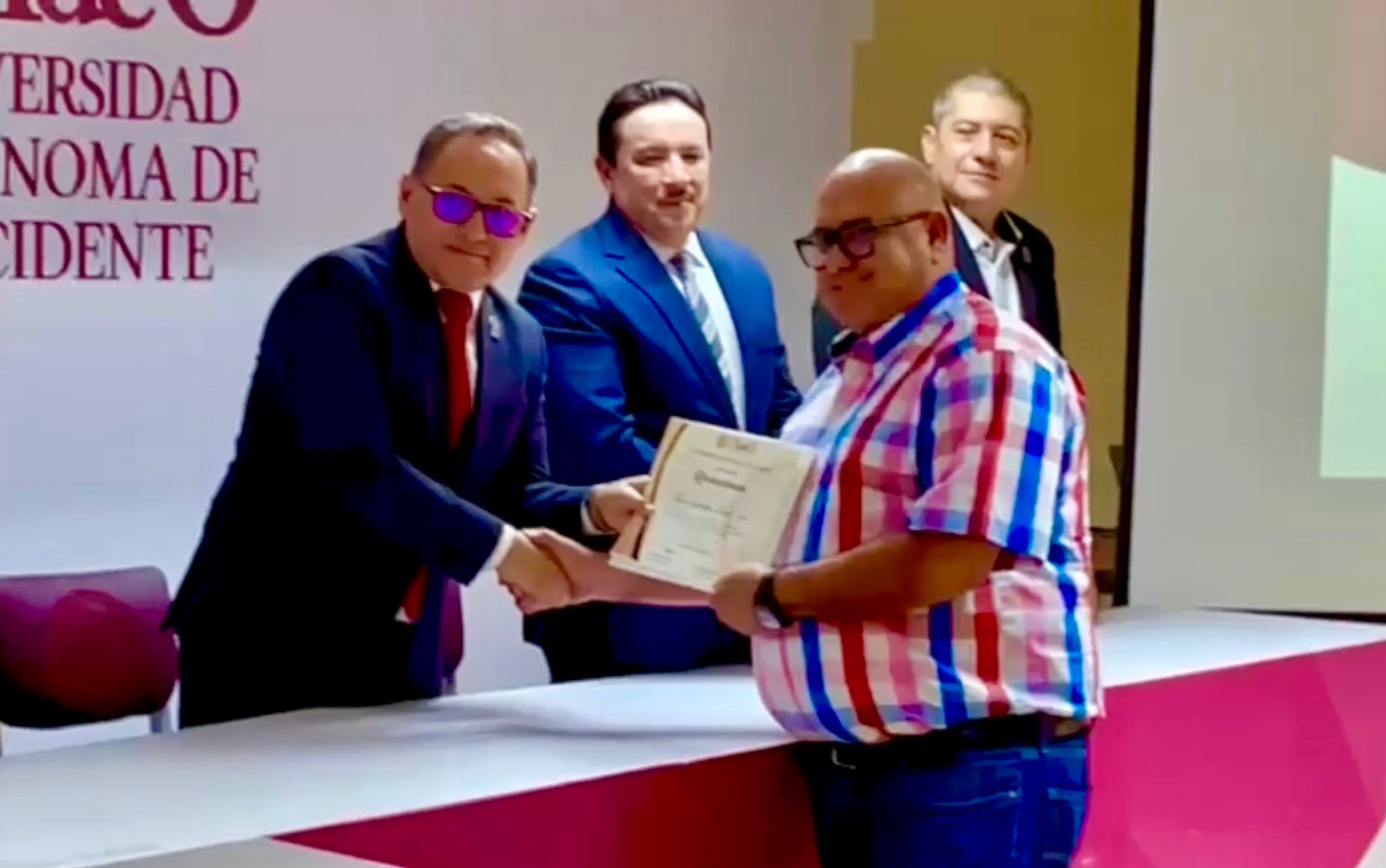 Al destacado periodista del Portal Phoenix que pertenece a la Organización de Comunicadores Unidos de Sinaloa, como maestro de la Universidad pública se le resalta su tarea docente a manos del Rector Pedro Flores Leal.