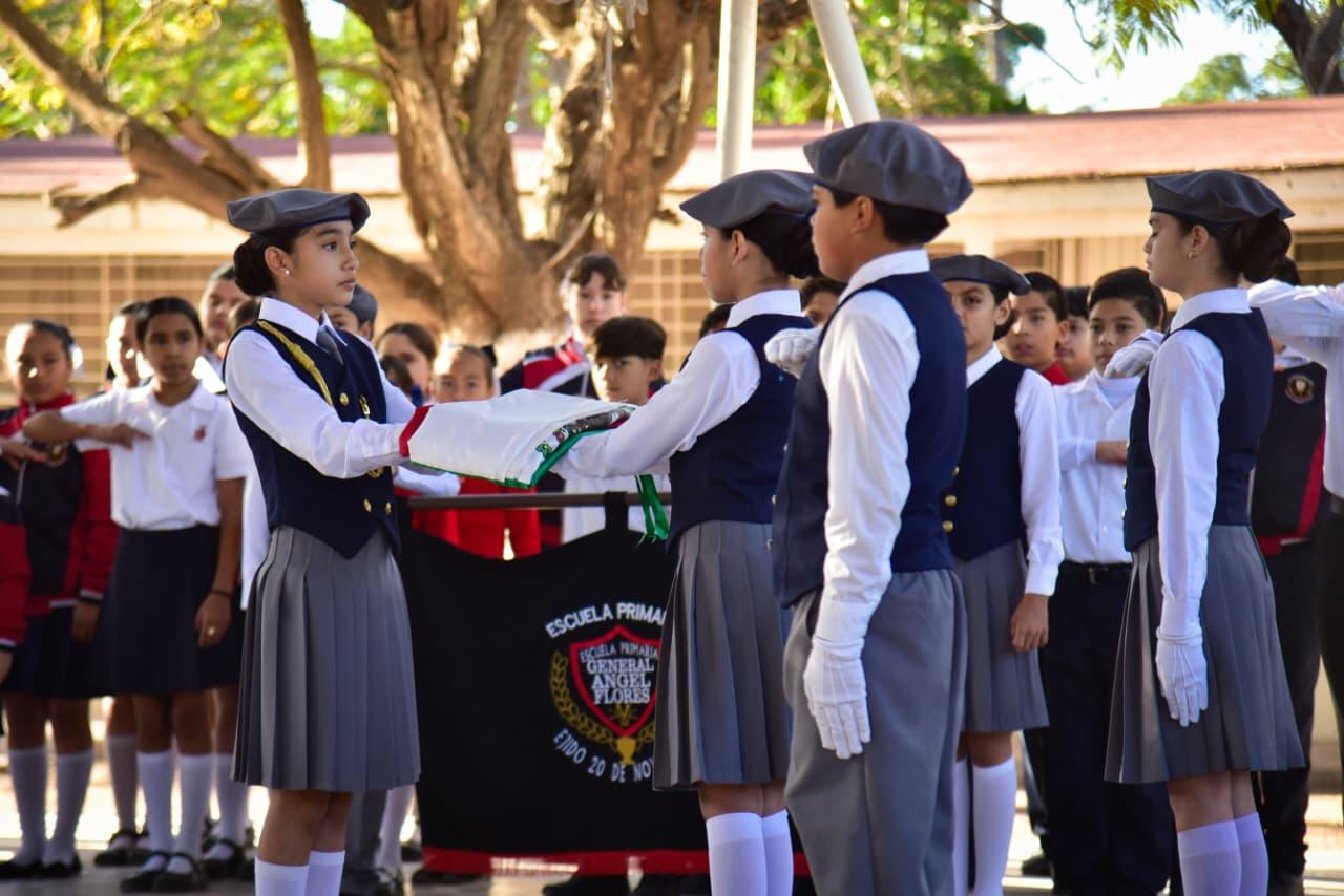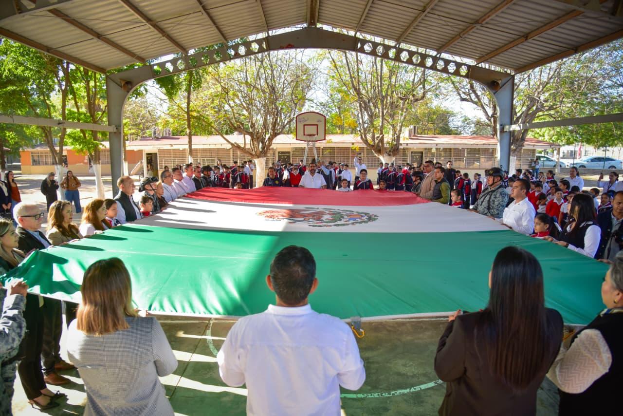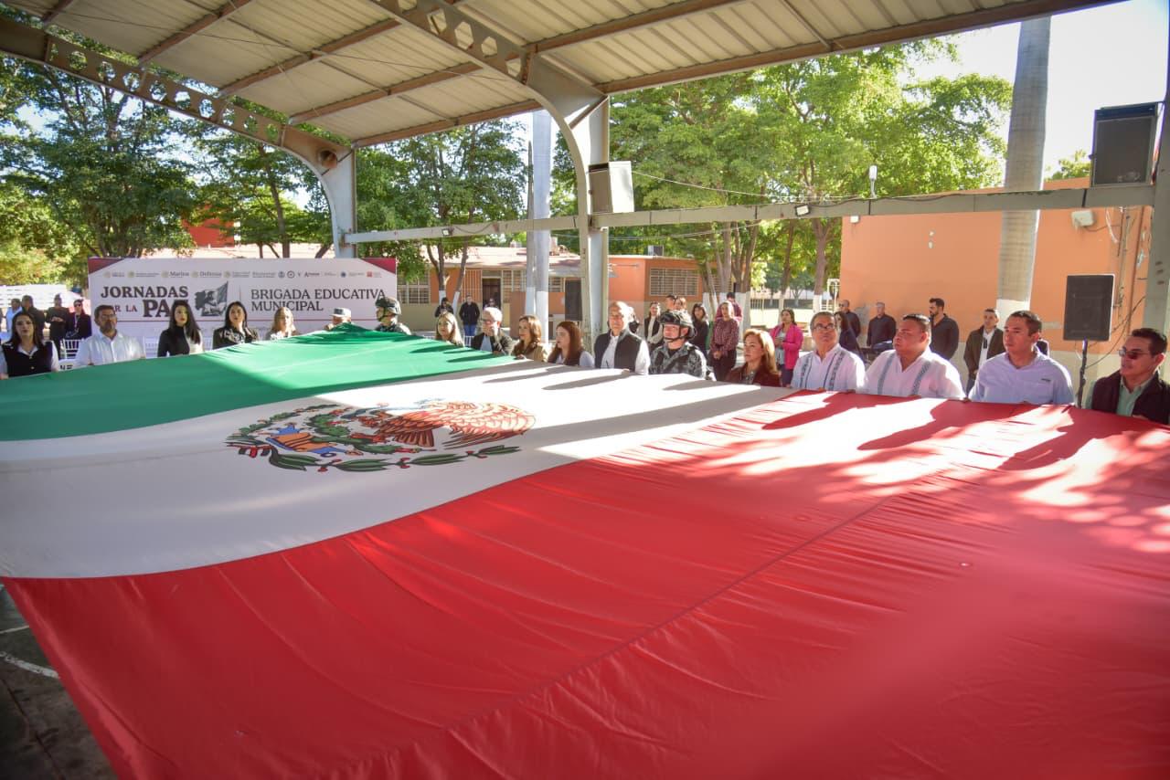 Los Mochis, Ahome, Sinaloa. – Con las manos formando una casa y la voz firme, las niñas y los niños, guiados por las palabras de Alexa Jazmín, dijeron al unísono: “Ahome, la casa de Todos”. Así arrancó el Homenaje Cívico por el Día de la Bandera, realizado este lunes en la Escuela Primaria Ángel Flores, del ejido 20 de Noviembre Nuevo, como parte de la Brigada Educativa Municipal en coordinación con las Jornadas de la Paz.