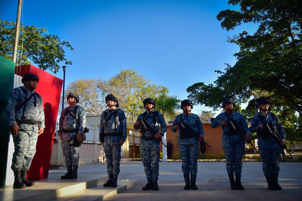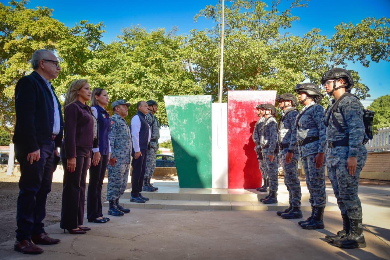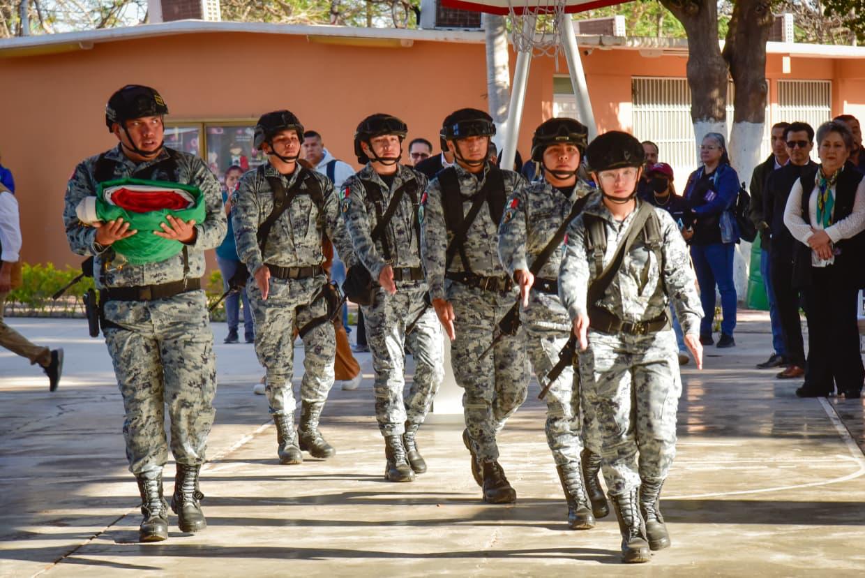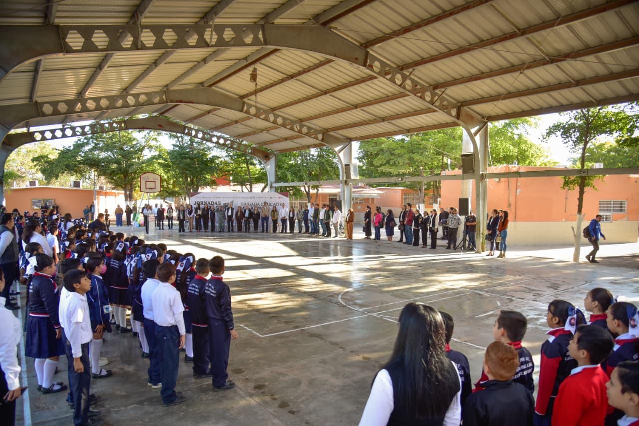 Los Mochis, Ahome, Sinaloa. – Con las manos formando una casa y la voz firme, las niñas y los niños, guiados por las palabras de Alexa Jazmín, dijeron al unísono: “Ahome, la casa de Todos”. Así arrancó el Homenaje Cívico por el Día de la Bandera, realizado este lunes en la Escuela Primaria Ángel Flores, del ejido 20 de Noviembre Nuevo, como parte de la Brigada Educativa Municipal en coordinación con las Jornadas de la Paz.