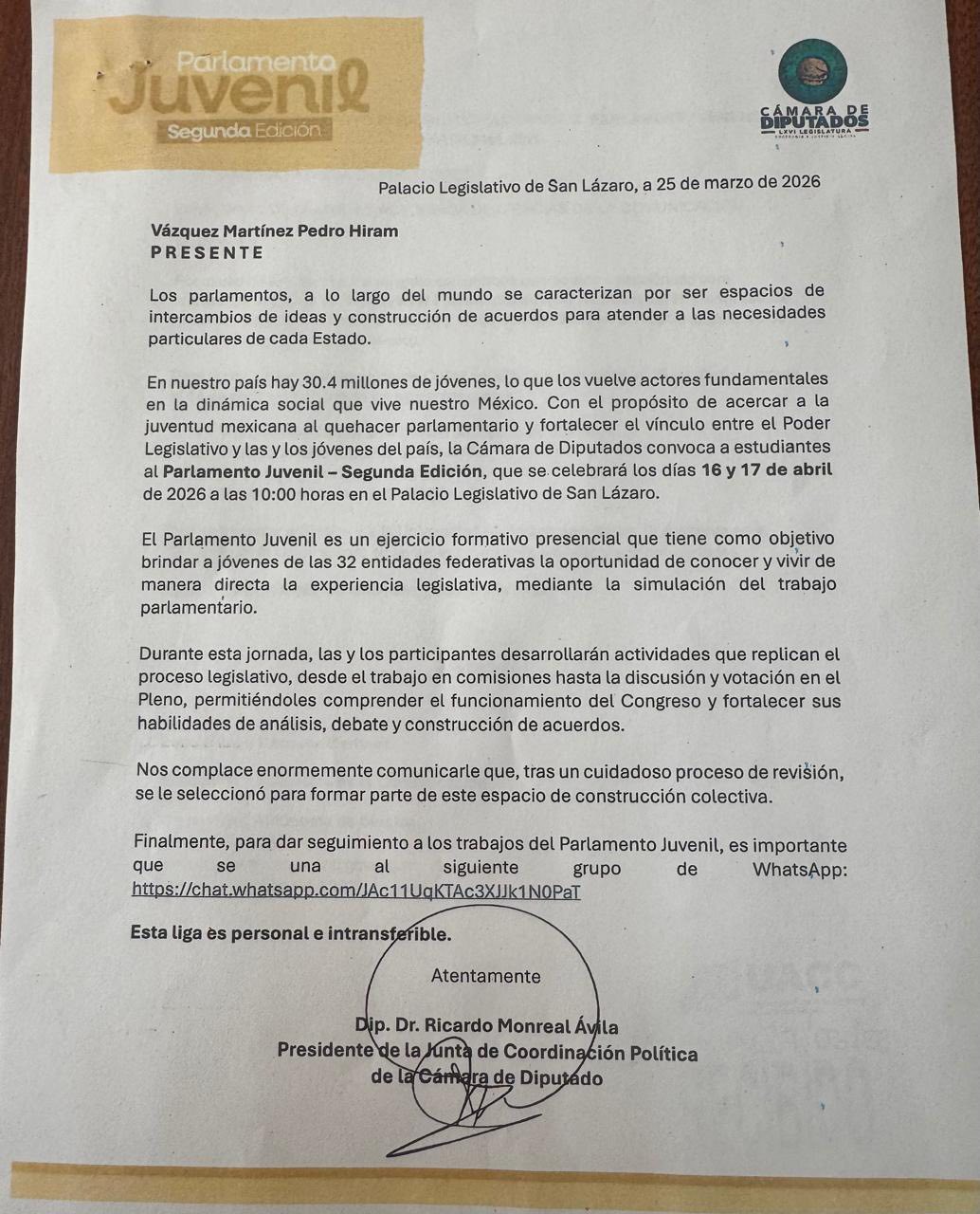La Universidad Autónoma de Sinaloa (UAS) continúa consolidándose como un semillero de talento joven comprometido con los retos actuales del país. En esta ocasión, el alumno Pedro Hiram Vázquez Martínez, de la Unidad Académica de Ciencias de la Comunicación, fue seleccionado para participar en el Segundo Parlamento Juvenil, un ejercicio nacional que se llevará a cabo en el Congreso de la Unión y que reúne a jóvenes con propuestas en materias social, política y tecnológica.