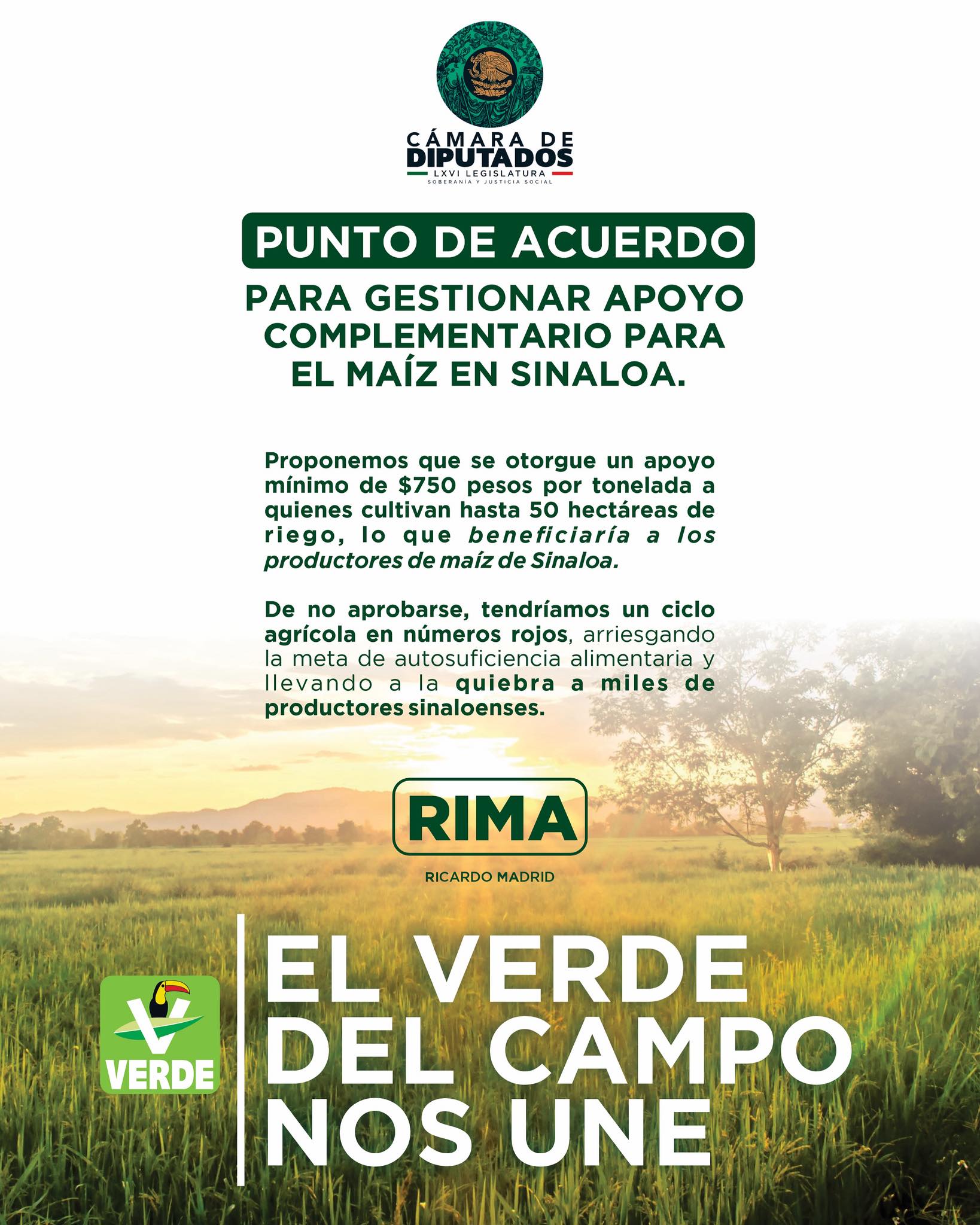 La propuesta es apoyar con 750 pesos por tonelada de maíz a los pequeños y medianos productores del estado tomando en cuenta que en los últimos 34 años, Sinaloa se ha consolidado como el granero de México, aportando más de 6 millones de toneladas de maíz, lo que ha permitido garantizar la oferta y autosuficiencia de maíz blanco y estabilizar el precio del principal alimento que consumimos todos los mexicanos: las tortillas.
