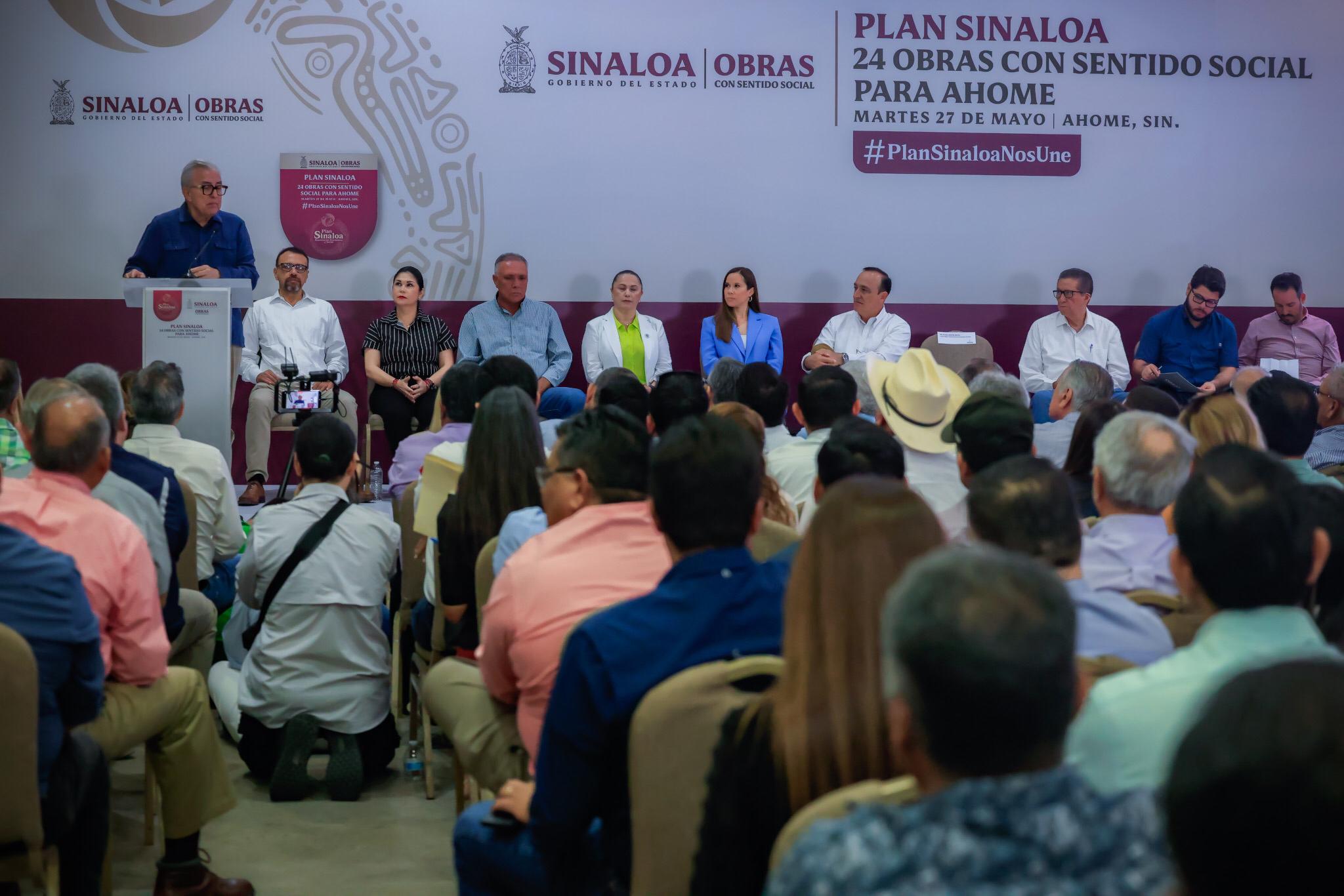 Respecto al municipio de Ahome, con el desarrollo de 24 obras con sentido social y una inversión superior a los 72.8 millones de pesos, se busca posicionarlo como un referente de desarrollo industrial, logístico y urbanístico, por ello, se atenderán diversas y añejas demandas de los vecinos como la rehabilitación de drenaje sanitario y colectores pluviales en la cabecera municipal y en el ejido Bacorehuis segunda etapa, sindicatura Gustavo Díaz Ordaz, y se garantizará el abasto de agua potable gracias a la ampliación de la planta potabilizadora en Topolobampo y la construcción del clarificador en la planta del Poblado Seis, Villa Gustavo Díaz Ordaz, así como obras de pavimentación para mejorar la movilidad, dignificando, con ello, la vida de los vecinos.