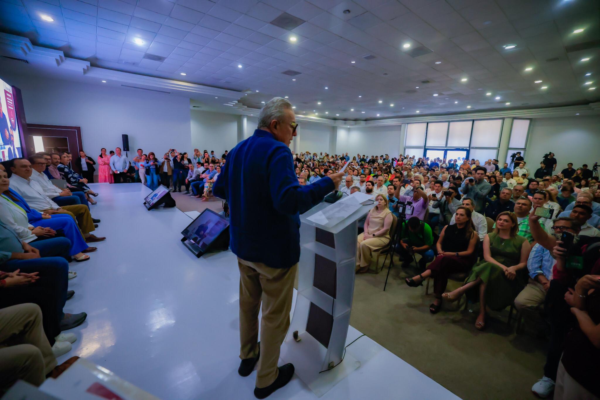 Los Mochis, Ahome, Sinaloa. – Ante cientos de hombres y mujeres de la clase empresarial, profesionistas, trabajadores y representantes de organismos e instituciones de Los Mochis, el Gobernador Rubén Rocha Moya, presentó un paquete de 24 obras para el norte del estado del Plan Sinaloa de Reactivación Económica y Social, así como el programa de 17 mil 500 viviendas, el proyecto Topolobampo Polo de Desarrollo, y la construcción de un puente de 72 km de carretera de la ruta que va desde el puerto hasta Ojinahua Chihuahua.
