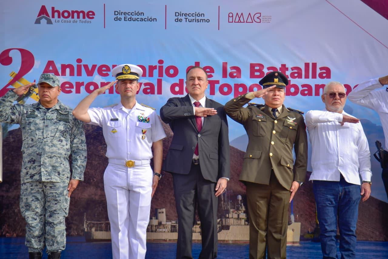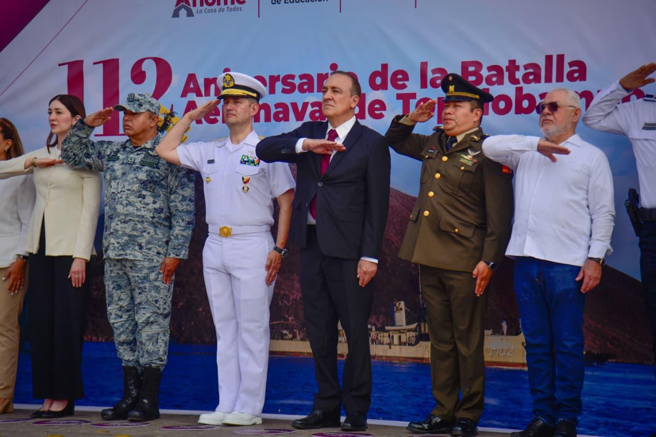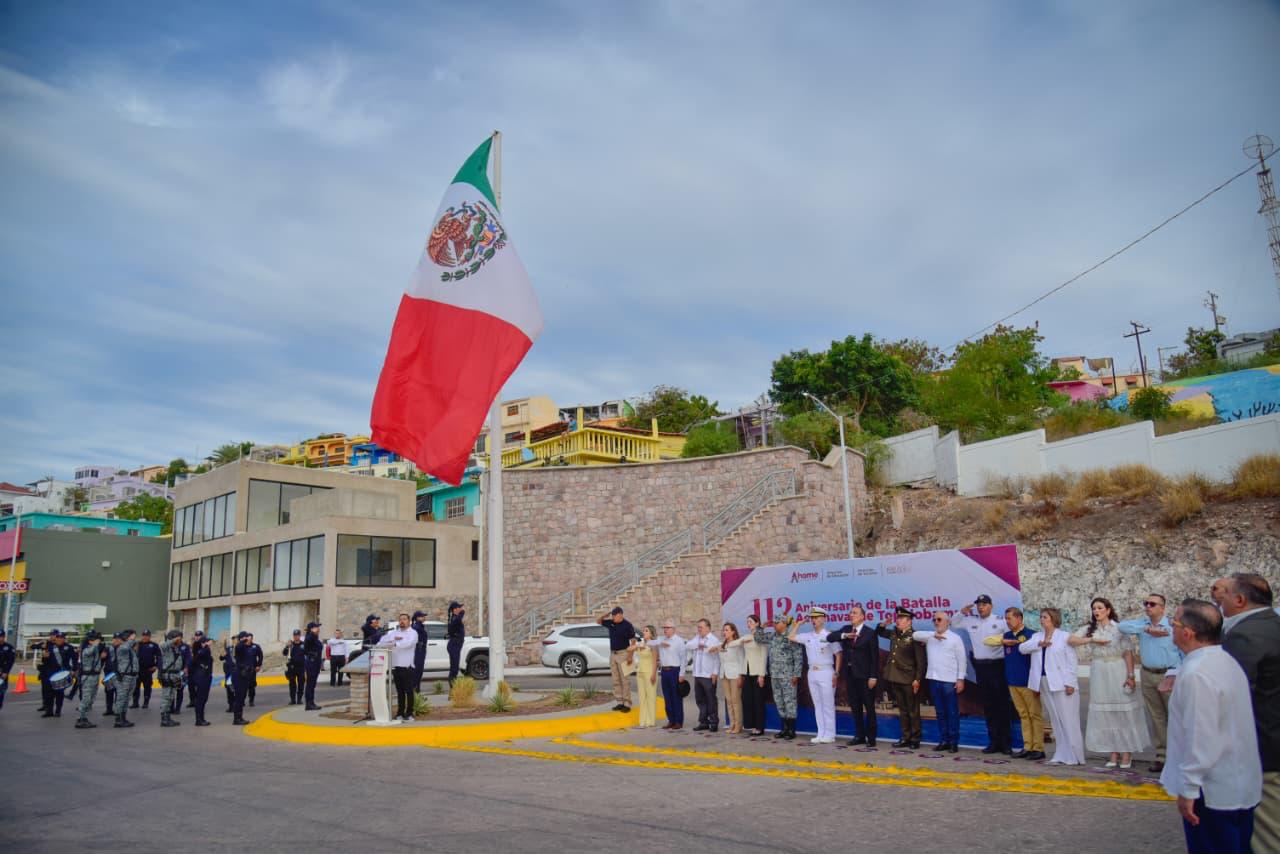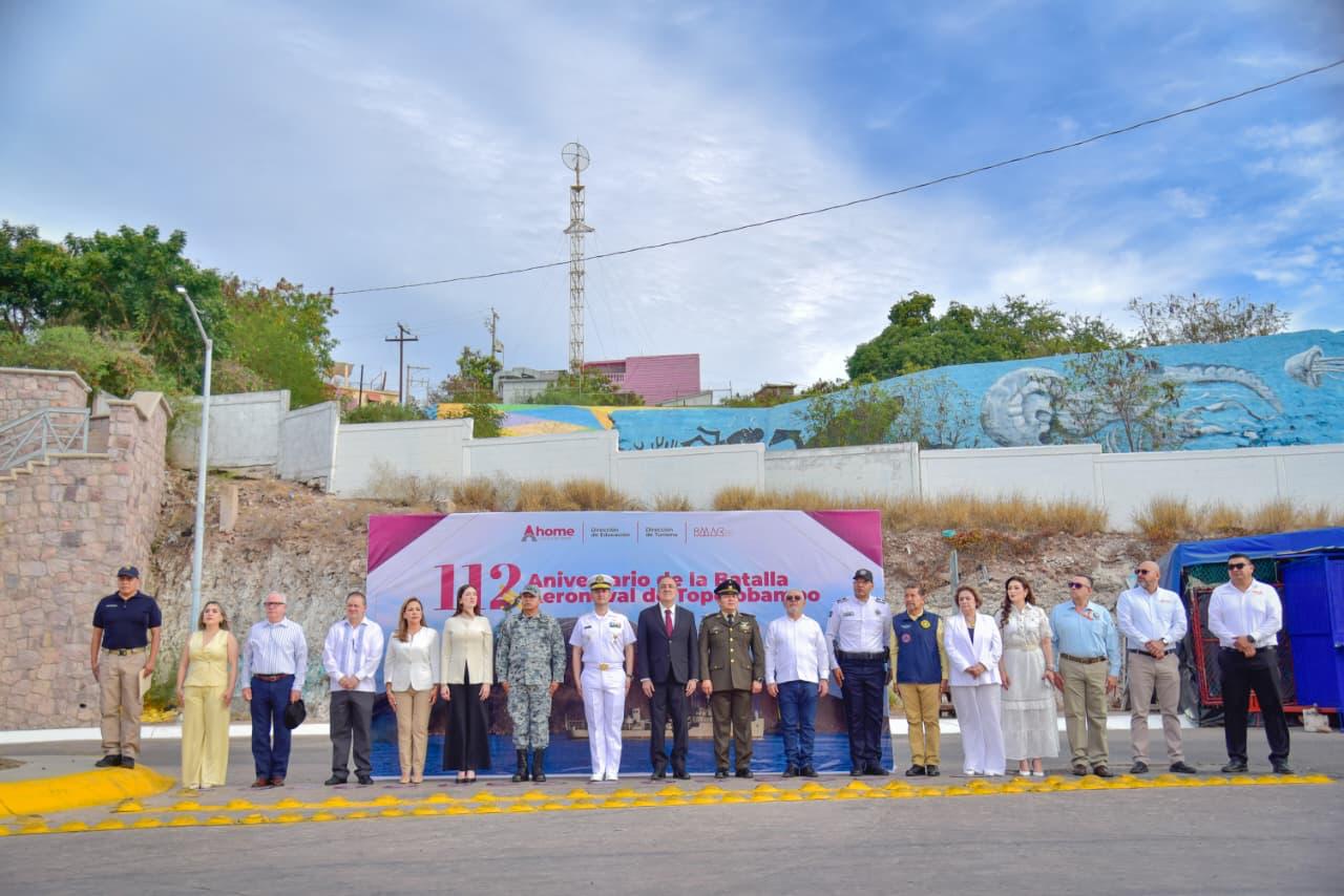 Puerto de Topolobampo, Ahome, Sinaloa. –Con una ceremonia cívica e izamiento de Bandera a toda asta en la glorieta del malecón del puerto de Topolobampo, a cargo de personal de las fuerzas armadas y de seguridad, inició el programa conmemorativo del 112 aniversario del primer combate aeronaval del mundo sucedido el 14 de abril de 1914 en la época de la Revolución Mexicana en esta bahía de Topolobampo.