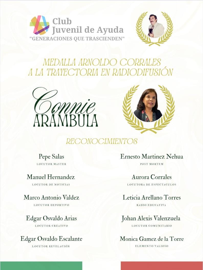 Los Mochis, Sinaloa. – El Club Juvenil de Ayuda “Generaciones que Trascienden” dio a conocer que el próximo 20 de septiembre se llevará a cabo la entrega de la Medalla Arnoldo Corrales a la Trayectoria en Radiodifusión, la cual en esta edición será otorgada a Connie Arámbula, destacada comunicadora que ha dejado huella en el ámbito radiofónico.