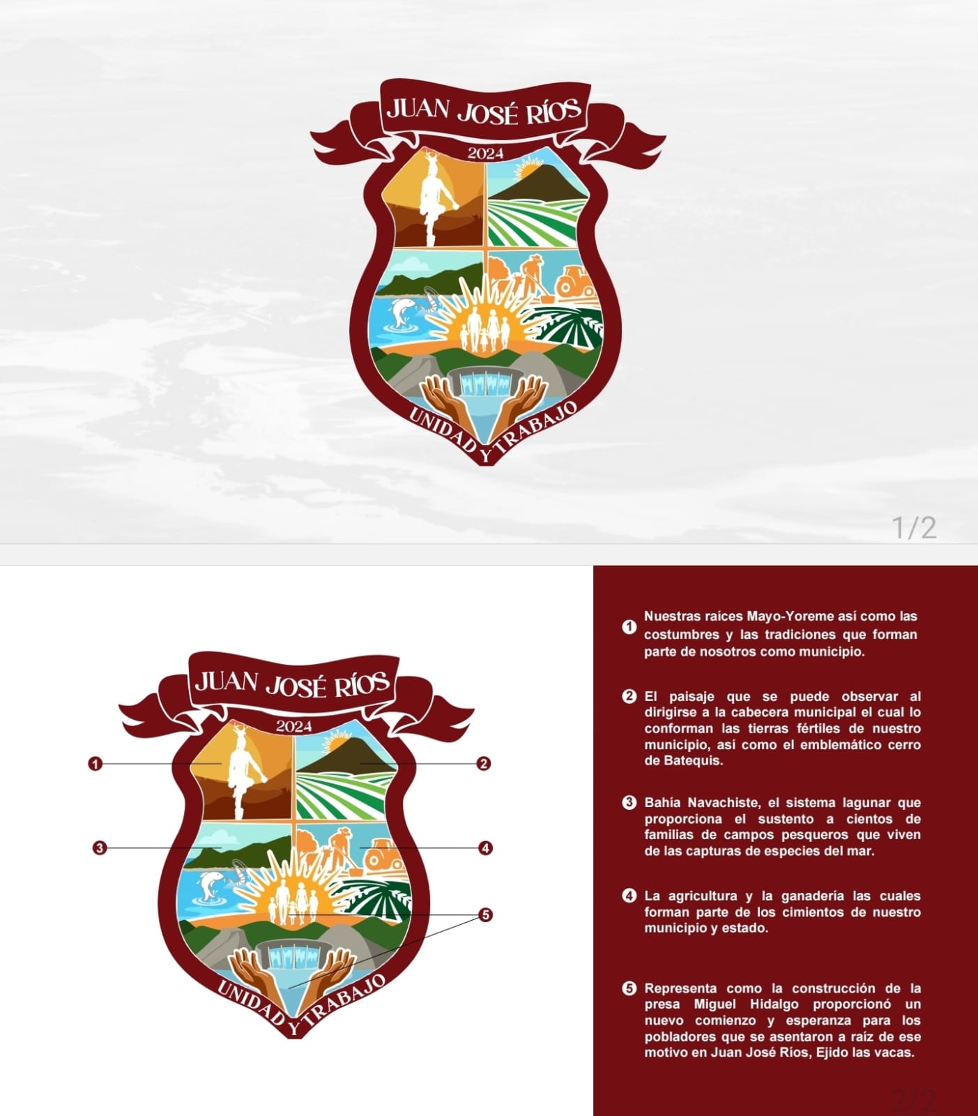 Juan José Ríos, Sinaloa. – La alcaldesa Evangelina Llanes Carreón encabezó la mañana de este sábado 21 de junio la sesión ordinaria número 12 de cabildo en donde se probó por unanimidad el escudo oficial para el municipio de Juan José Ríos.