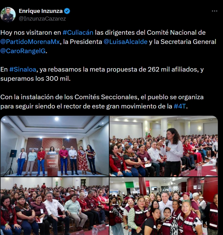 “Hoy nos visitaron en #Culiacán las dirigentes del Comité Nacional de @PartidoMorenaMx, la Presidenta @LuisaAlcalde y la Secretaria General @CaroRangelG. En #Sinaloa, ya rebasamos la meta propuesta de 262 mil afiliados, y superamos los 300 mil. Con la instalación de los Comités Seccionales, el pueblo se organiza para seguir siendo el rector de este gran movimiento de la #4T“.