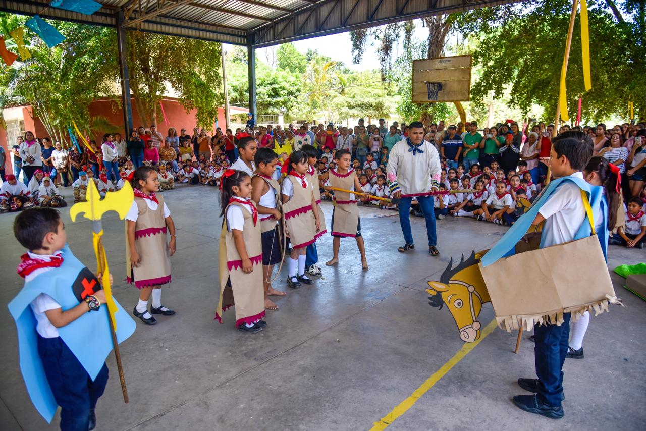 Las niñas y niños se lucieron, acompañados de sus maestros y algunos padres de familia, con la escenificación de la conquista, evangelización y devenir histórico de los pueblos originarios de la localidad, entre ellos Zapotillo.