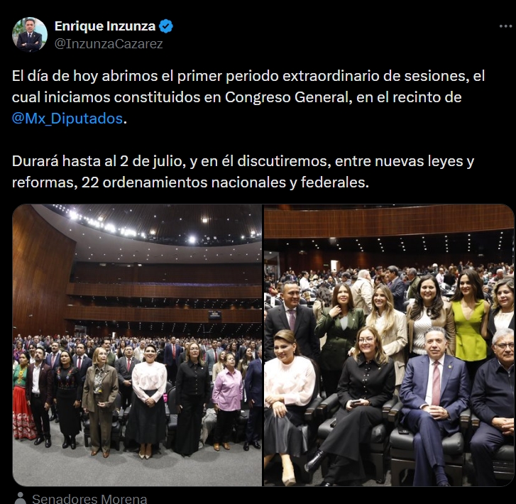 El día de hoy abrimos el primer periodo extraordinario de sesiones, el cual iniciamos constituidos en Congreso General, en el recinto de @Mx_Diputados. Durará hasta al 2 de julio, y en él discutiremos, entre nuevas leyes y reformas, 22 ordenamientos nacionales y federales”, escribió.