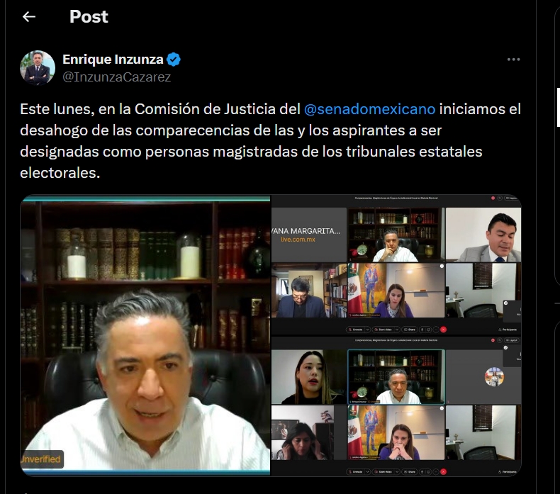 Este lunes el Senador Enrique Inzunza compartió en sus redes el trabajo que se realiza en las comparecencias de las y los aspirantes a ser designados magistradas y magistrados de tribunales estatales electorales.