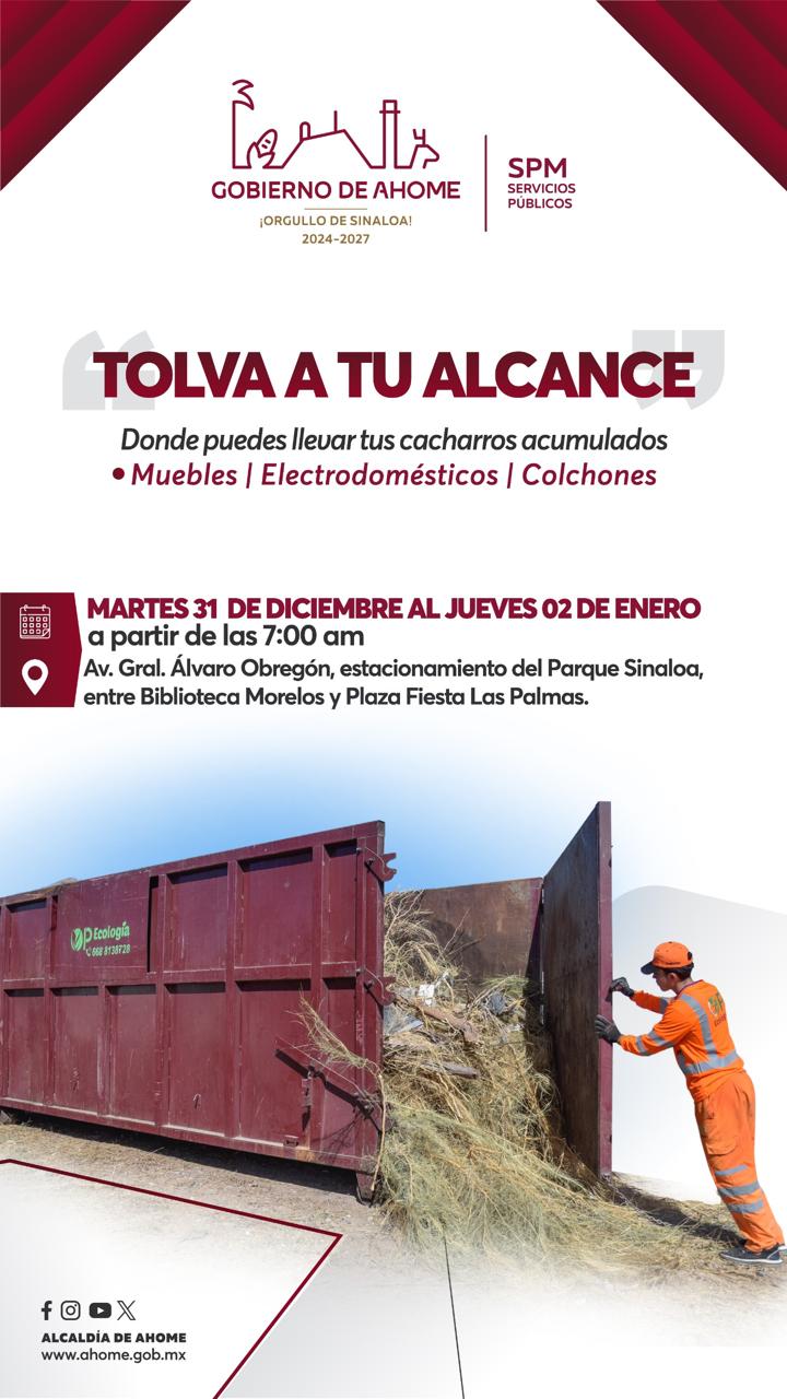 Para quienes necesiten deshacerse de su basura durante el 1 de enero, el funcionario indicó que la tolva estará instalada en el estacionamiento del Parque Sinaloa, por la calle Obregón.