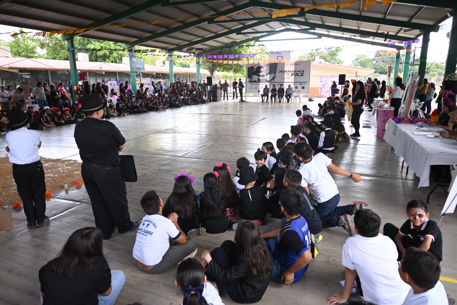 Sindicatura de Bachoco, Juan José Ríos, Sinaloa. – Entre maravillosas tonalidades naranjas, altares y decoraciones alusivas al Día de Muertos, se vivió una excelente Jornada por la Paz denominada “Exhibición de Tradiciones de Día de Muertos” en la Escuela Primaria Benito Juárez de la Sindicatura de Bachoco.