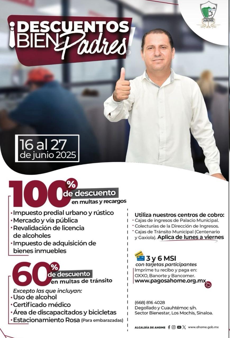 Los Mochis, Ahome, Sinaloa. – La Tesorería Municipal de Ahome invita a los contribuyentes a aprovechar la promoción de descuentos en el pago de impuestos municipales con motivo del Día del Padre, del 16 al 27 de junio, con bonificaciones de hasta el 100% en multas y recargos.