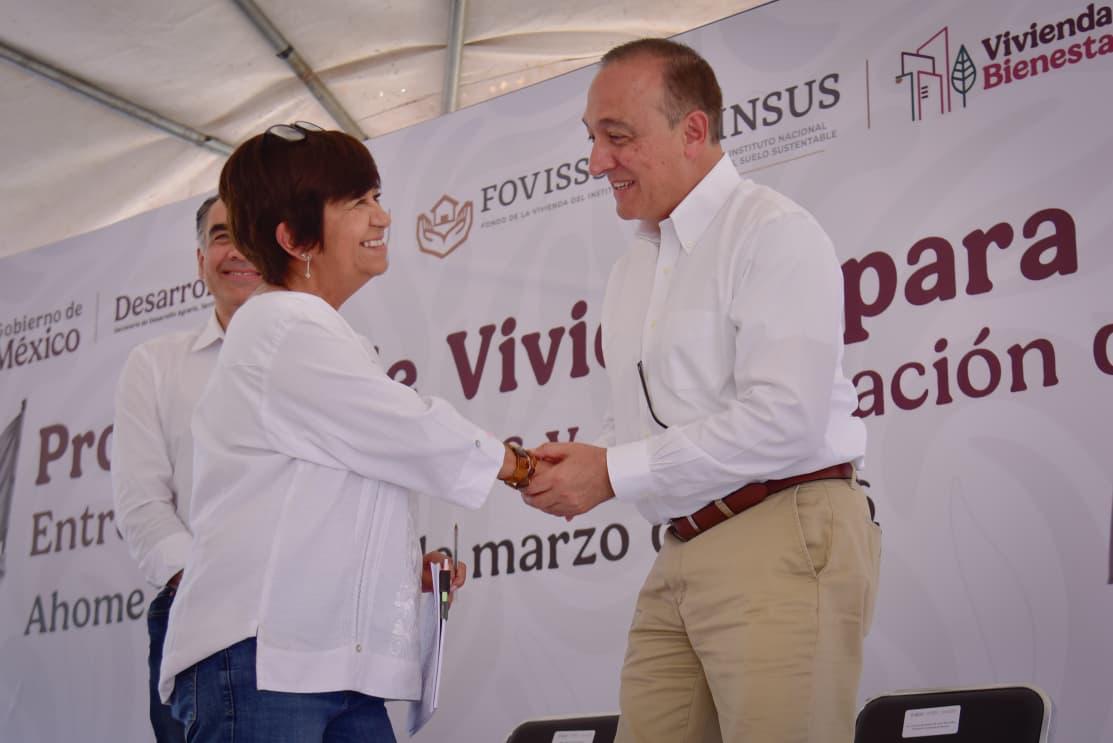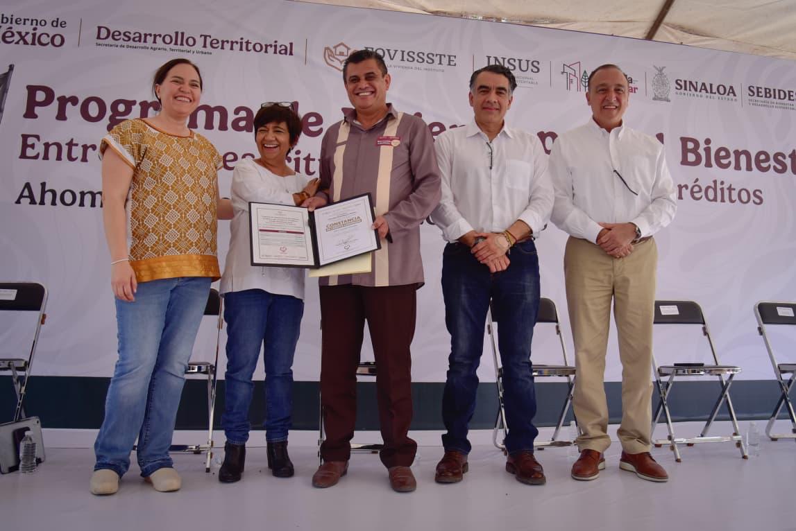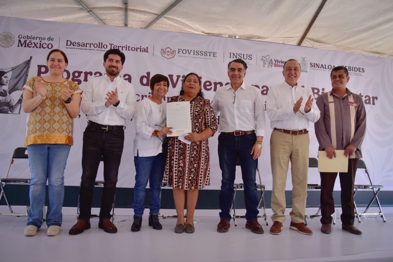 *La funcionaria federal visita Los Mochis por segunda vez en la semana, y hoy, acompañada del Director del INSUS, Víctor Guzmán y la Vocal Ejecutiva de FOVISSSTE, Jabnely Maldonado, teniendo como testigos al Alcalde Antonio Menéndez y el titular de SEBIDES Sinaloa, Omar López, otorgó los beneficios en la colonia Ferrocarrilera