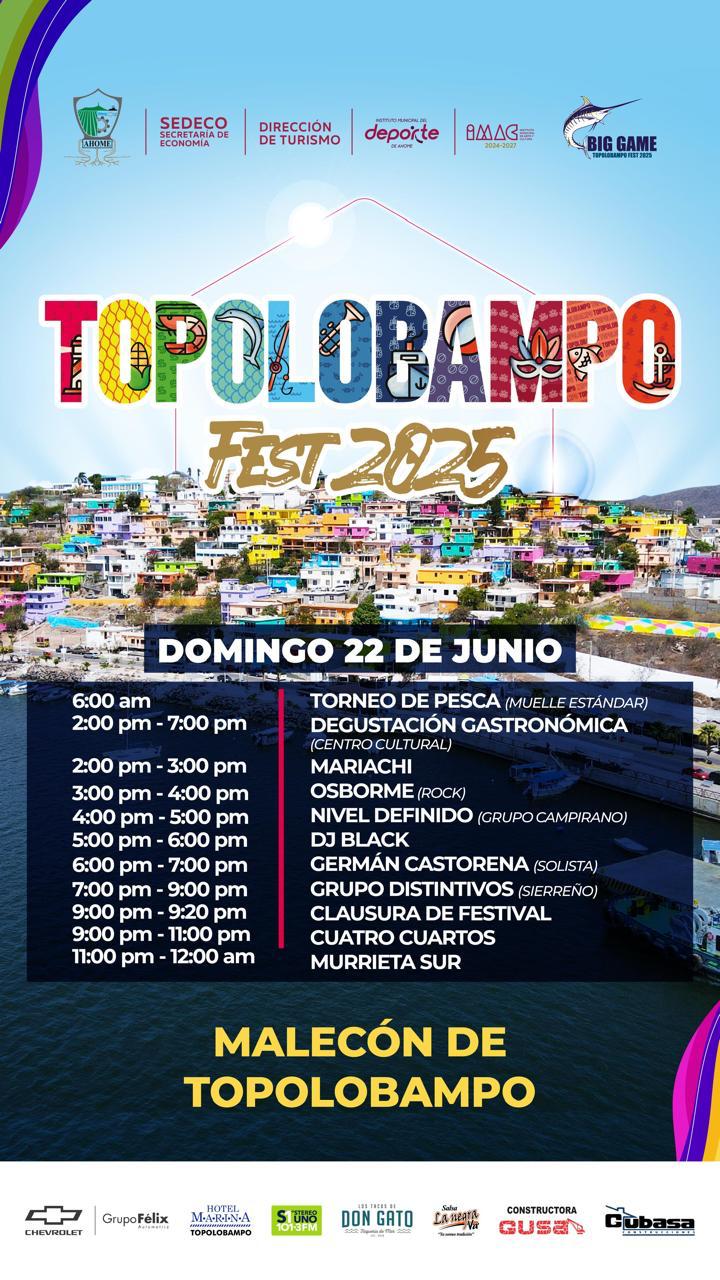 Topolobampo, Ahome, Sinaloa. –El malecón del puerto de Topolobampo se vestirá de fiesta artística, cultural, gastronómica, turística, comercial y deportiva, este fin de semana del sábado 21 y domingo 22 de junio, con el TOPOLOBAMPO Fest 2025, que organiza el Ayuntamiento de Ahome.