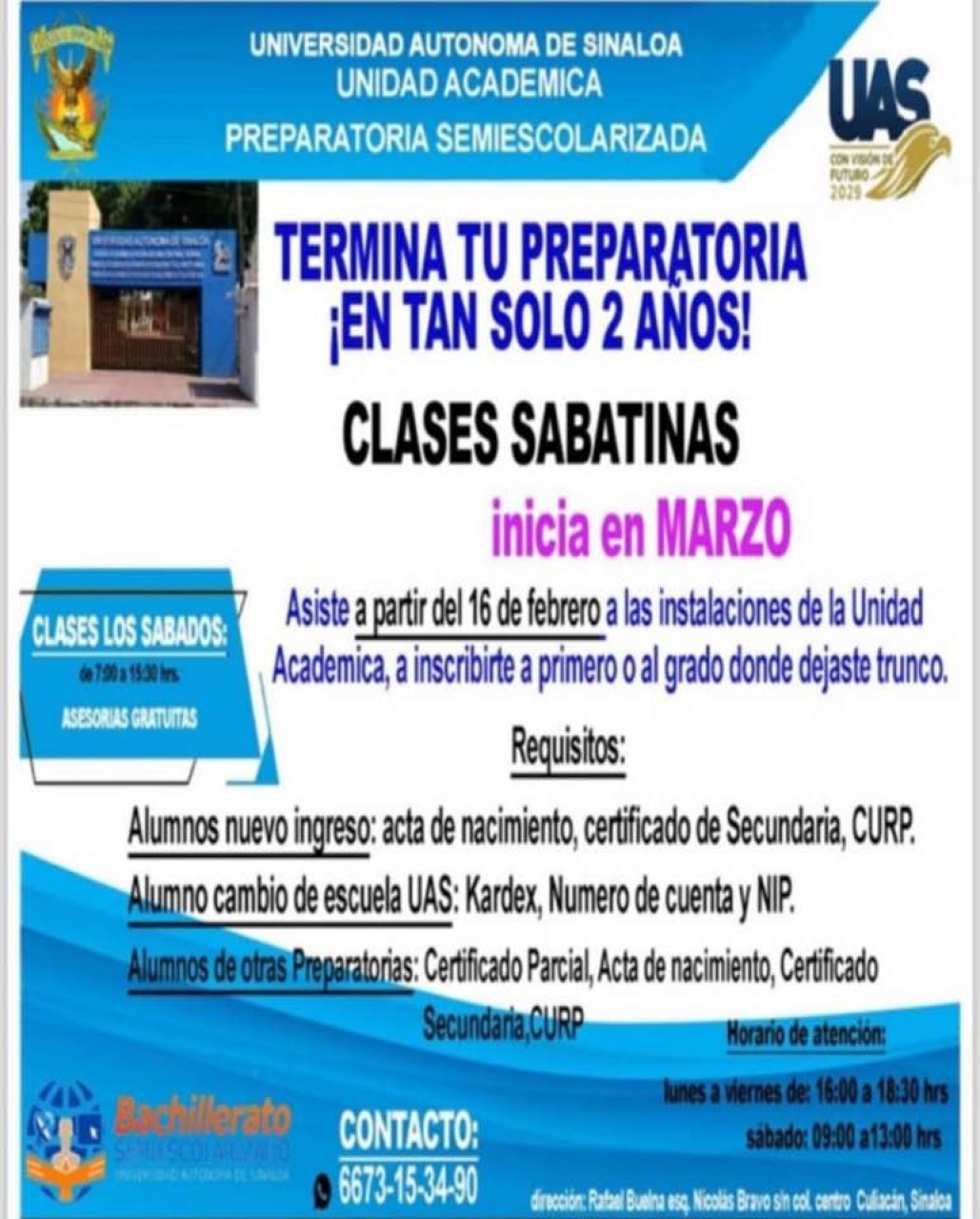 Conforme a la evolución de la educación, la Universidad Autónoma de Sinaloa (UAS) cuenta con diversas modalidades académicas tanto en el nivel medio superior como en el superior. Una unidad académica muy representativa de la “Casa Rosalina” es la Preparatoria Semiescolarizada de la zona centro, la cual abrirá su convocatoria para el primer cuatrimestre de 2026 del 16 de febrero al 15 de marzo.