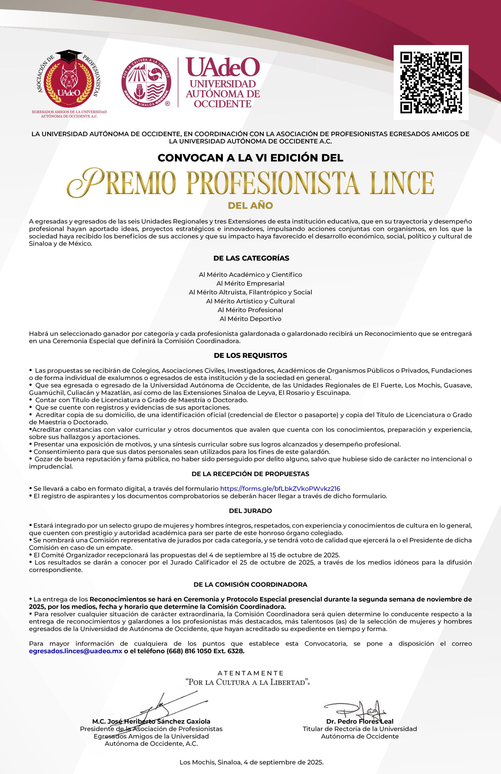 Culiacán, Sinaloa. – La Universidad Autónoma de Occidente en coordinación con la Asociación de Profesionistas egresados amigos de la UAdeO convocan a la VI Edición del Premio Profesionista Lince del Año 2025.
