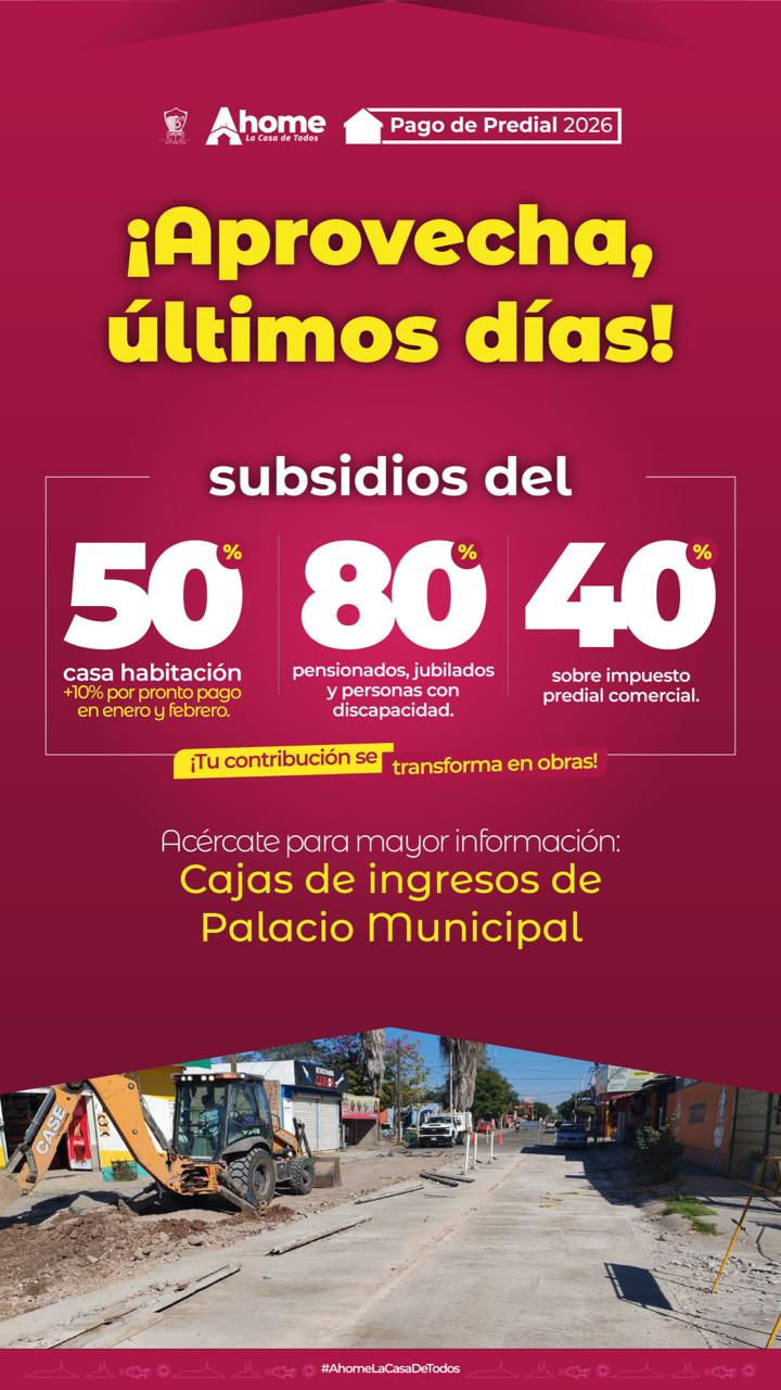 Los Mochis, Ahome, Sinaloa. –Con el objetivo de brindar facilidades a la ciudadanía para cumplir con sus contribuciones y contar con certeza jurídica sobre su patrimonio, la Tesorería Municipal de Ahome mantiene vigente hasta el último día de febrero el programa de descuentos en impuestos municipales, con un esquema de atención ampliada, módulos presenciales, alternativas digitales y opciones de pago con tarjeta.