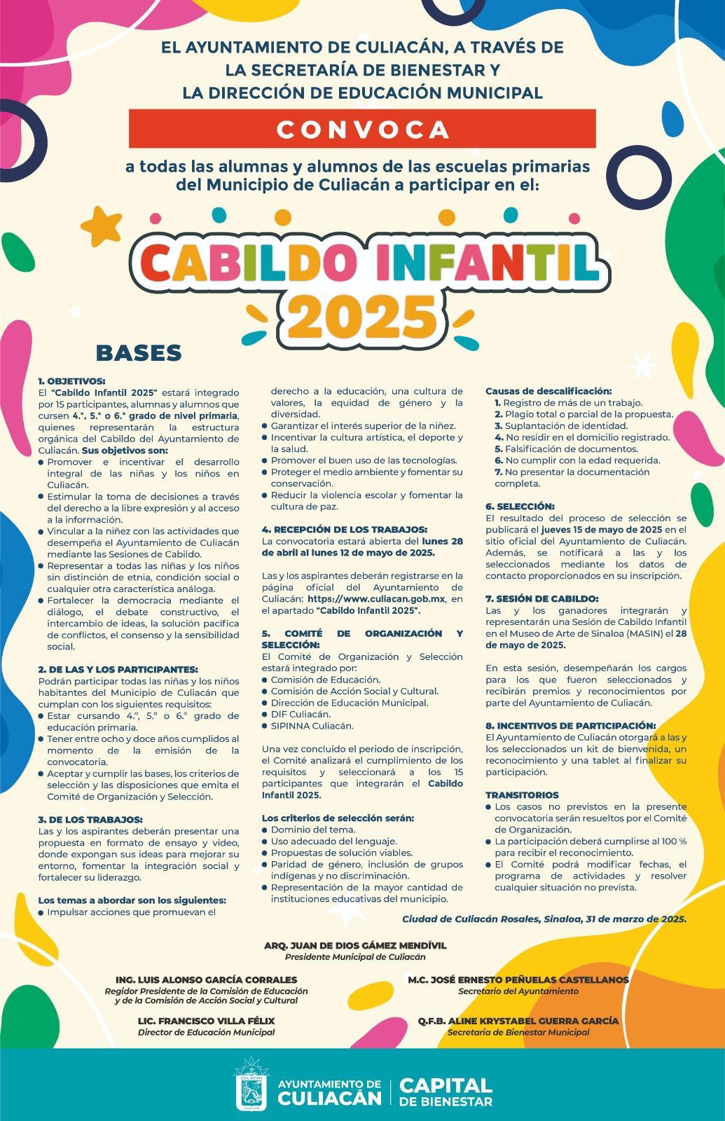 Culiacán, Sinaloa. – El Ayuntamiento de Culiacán, a través de la Secretaría de Bienestar y la Dirección de Educación Municipal, lanzó la convocatoria para que alumnas y alumnos de primaria participen en el Cabildo Infantil 2025, un espacio de expresión ciudadana destinado a las niñas y niños de la ciudad.