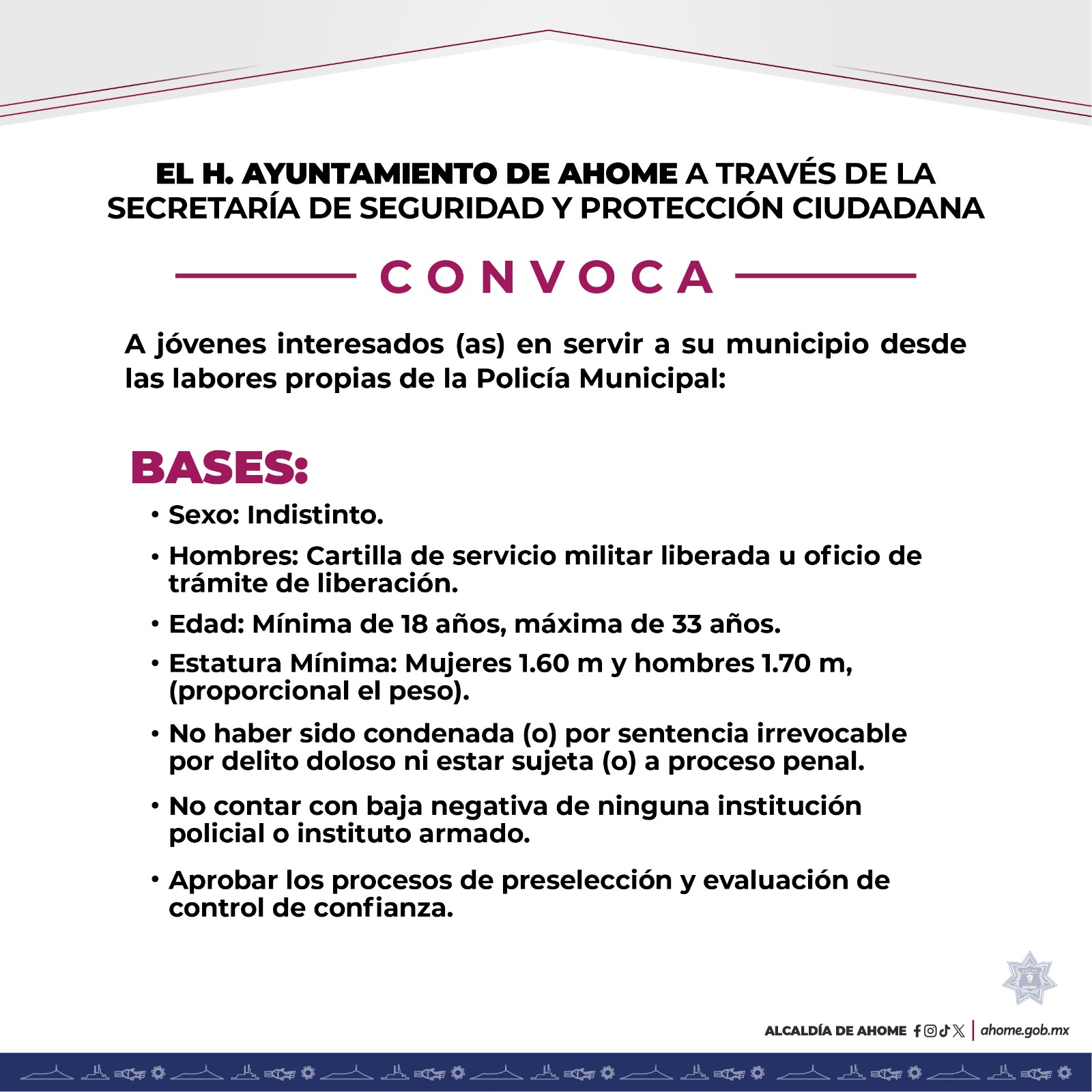 Los requisitos a cumplir incluyen cartilla liberada u oficio de trámite de liberación, edad entre 18 y 33 años, estatura mínima en mujeres 1.60 mts y hombres 1.70 mts, no haber sido condenados (a) por sentencia irrevocable por delito doloso o estar sujeto (a) a proceso penal, no contar con baja negativa de ninguna institución policial o instituto armado y aprobar los procesos de selección y evaluación de control de confianza. Horario de 8:00 am, hasta las 15:00 horas.